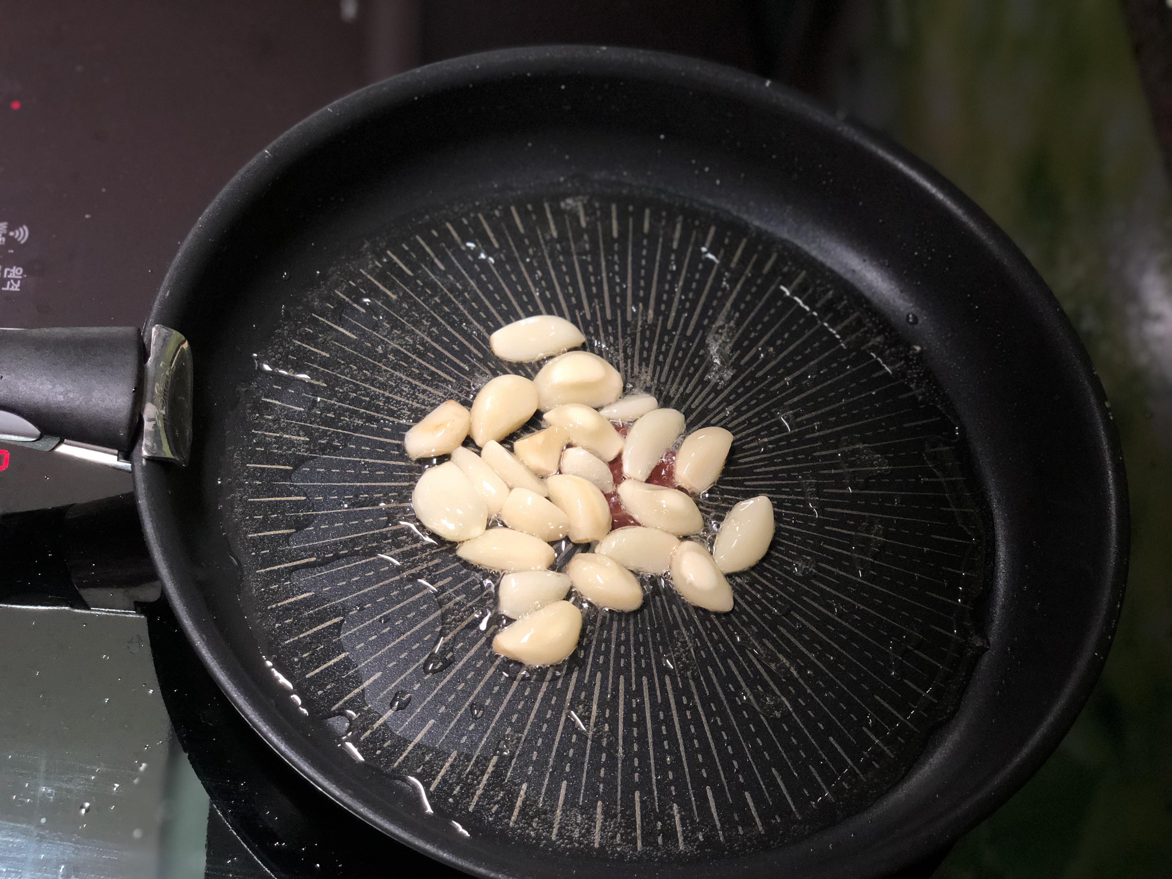팬에 식용유를 두르고 통마늘을 넣어 중불에 볶아 마늘향을 우려내요.