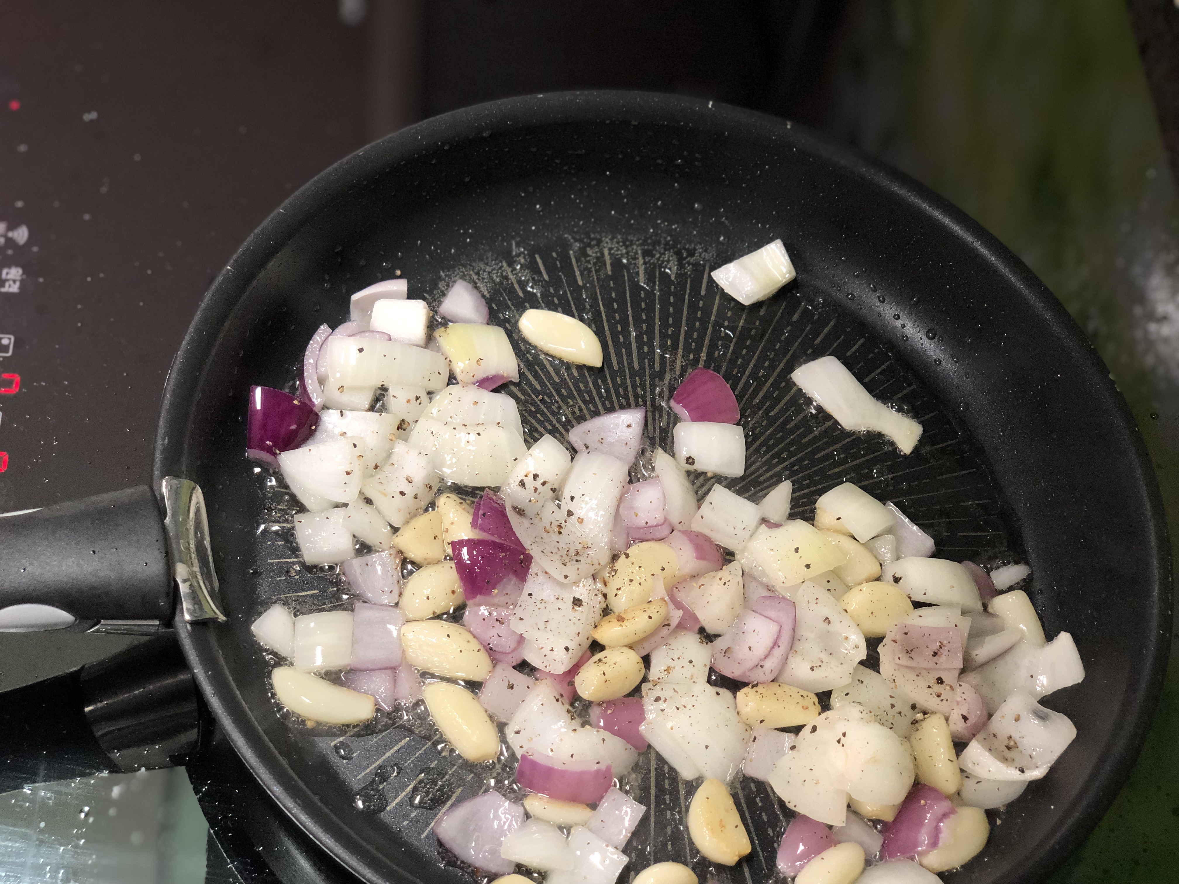 마늘이 반 정도 익으면 양파 넣고 볶아 단맛을 더해요.