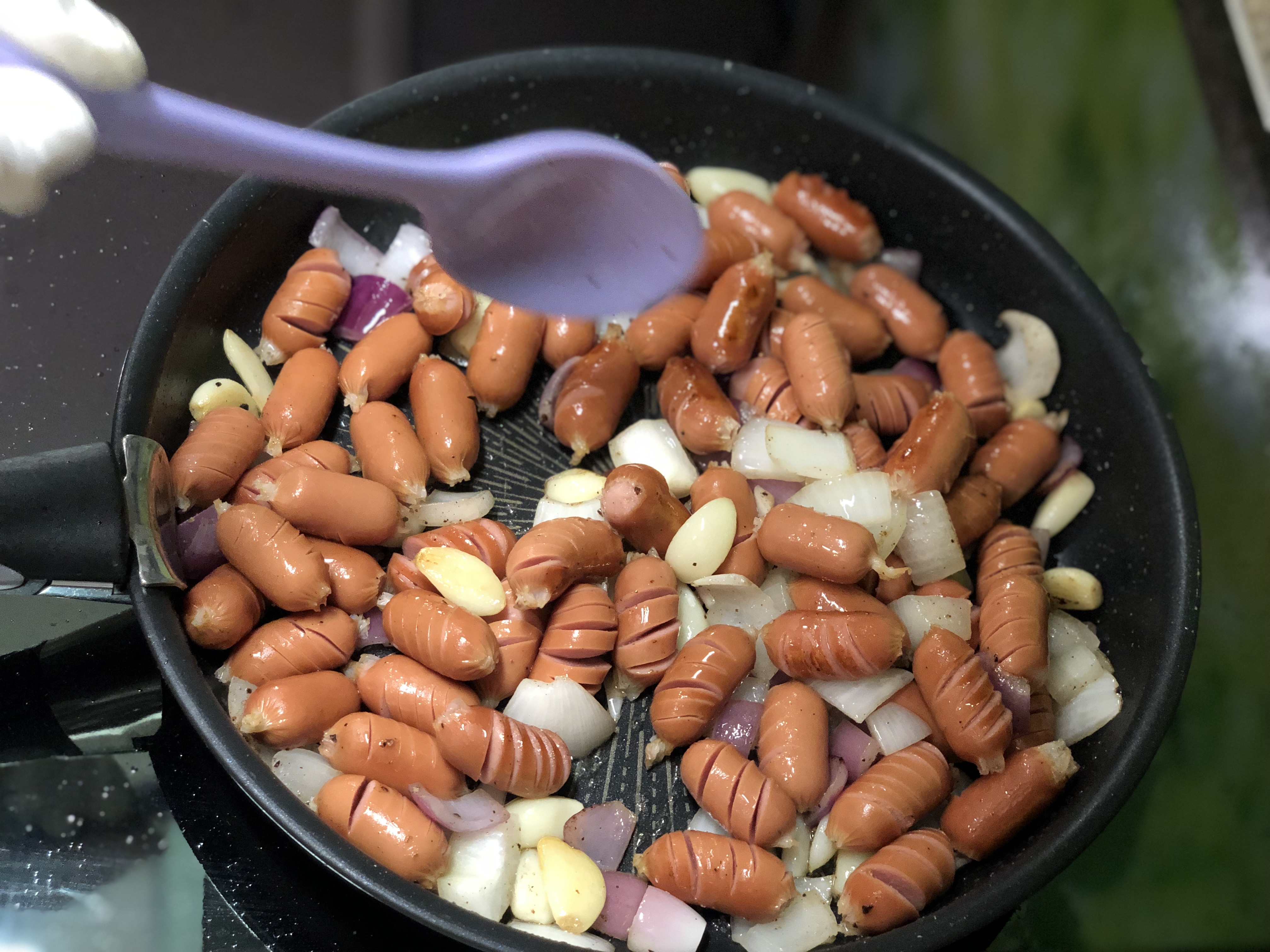소시지를 넣고 볶다가 거의 다 벌어지면