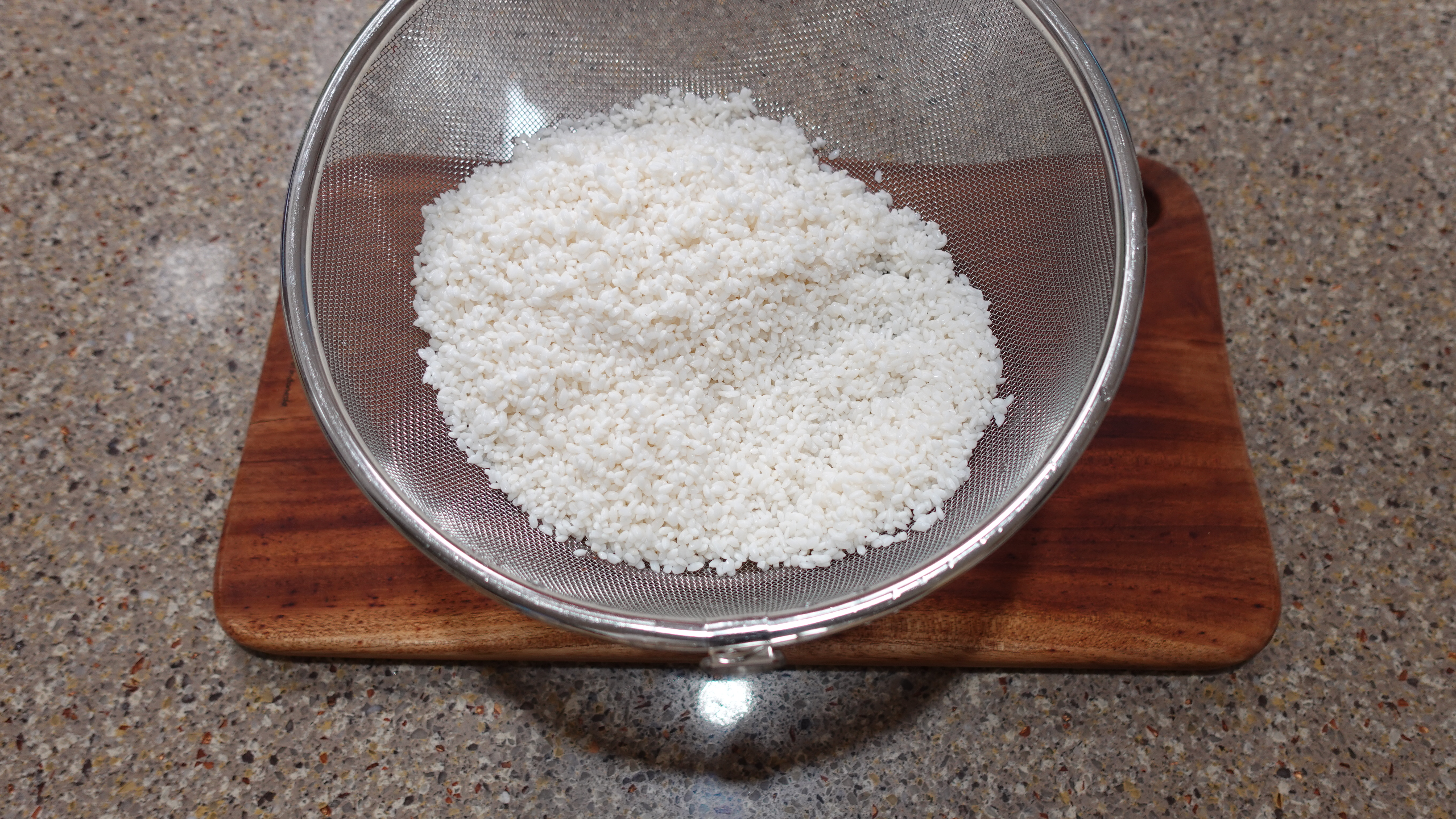불린 쌀과 찹쌀은 체에 밭쳐 물기를 제거하고 손으로 비비며 살짝 으깨줍니다. 믹서기보다는 손으로 으깨면 훨씬 식감이 좋아요.
