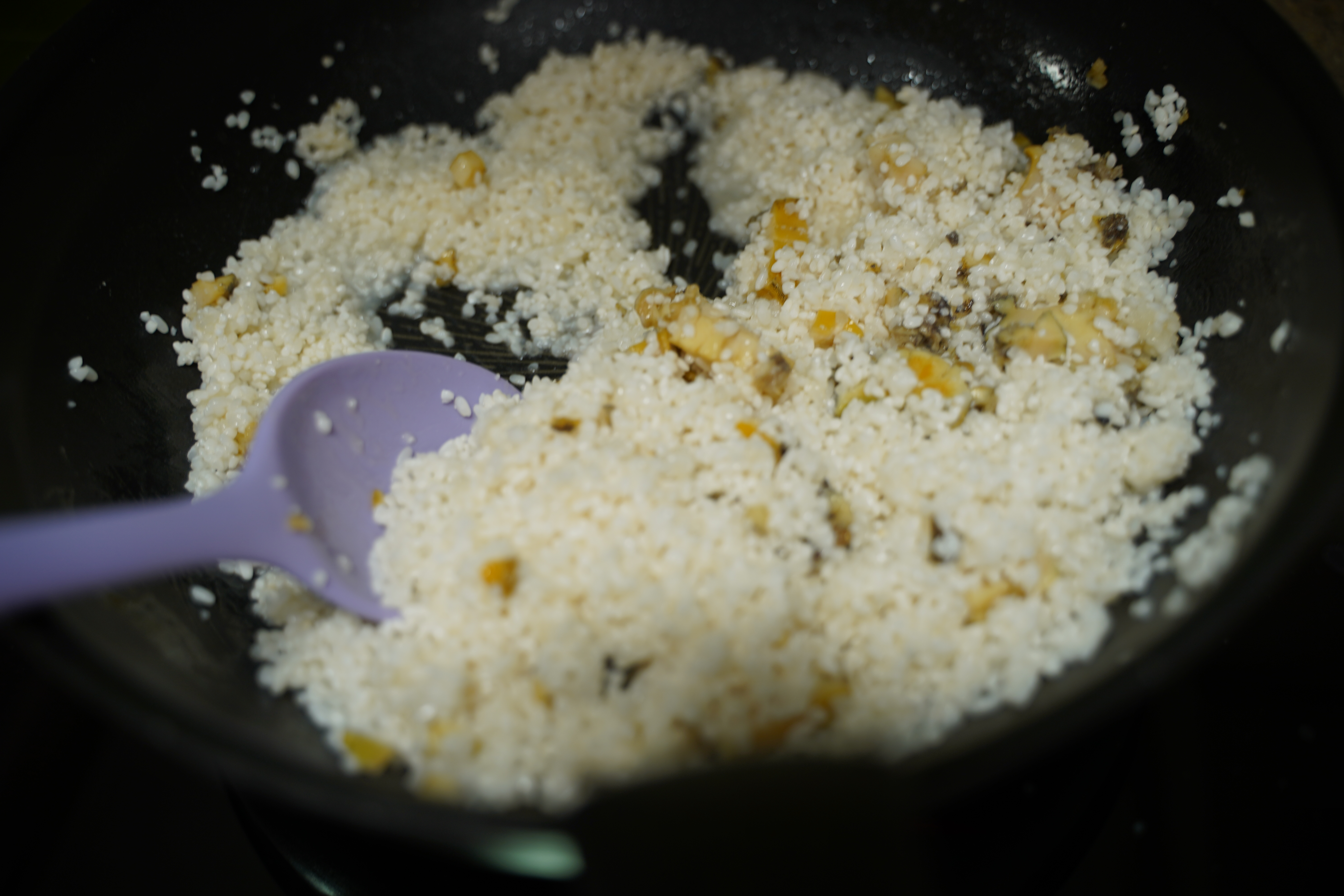 전복이 익으면 으깬 쌀을 넣고 수분을 날리며 볶아요.