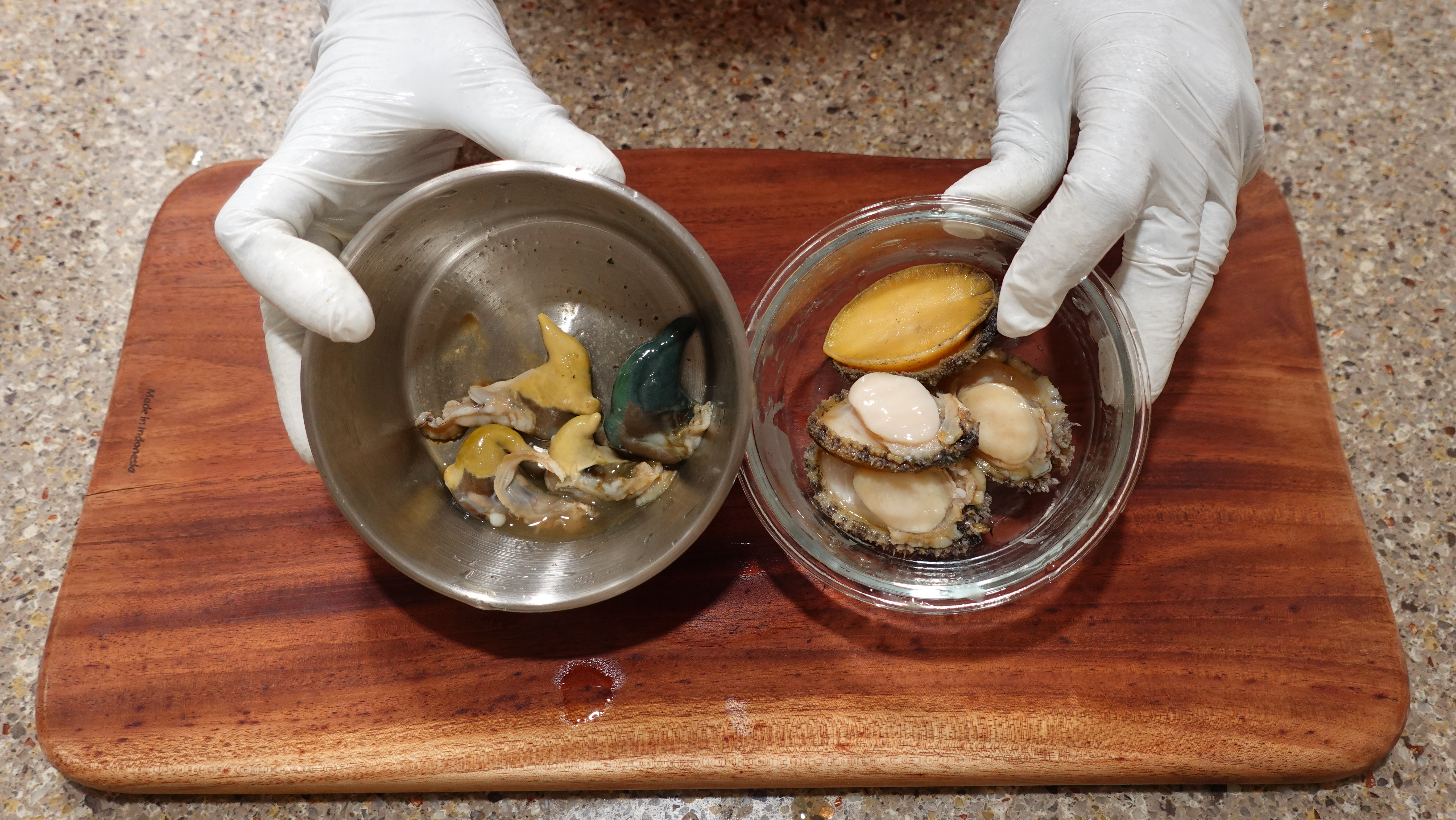 데친 후 바로 찬 물에 헹궈 식히고 살과 내장을 껍질에서 분리 한 뒤 다시 살과 내장을 분리해요.