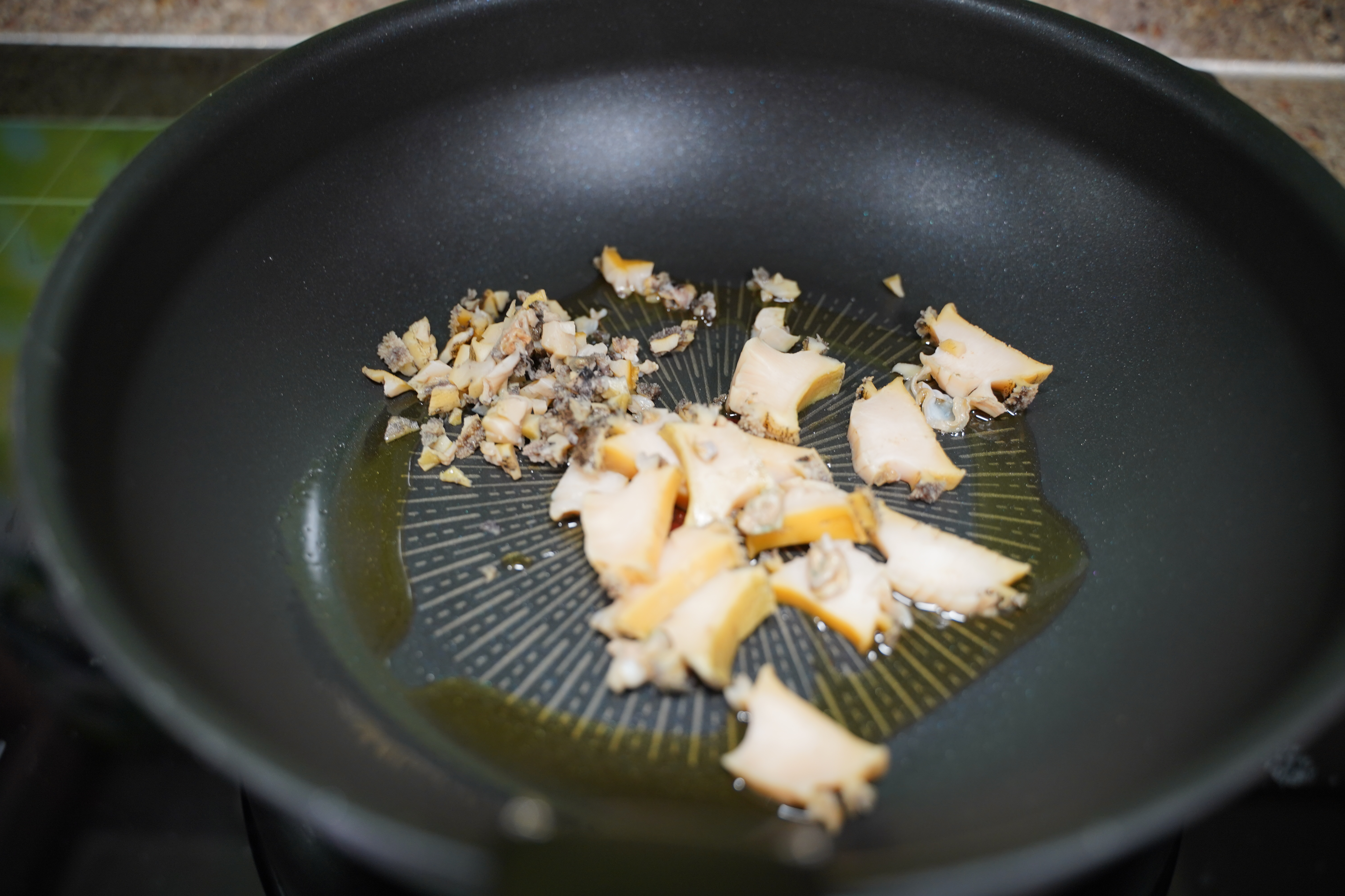팬에 참기름을 두르고 전복을 중불에서 볶아요.