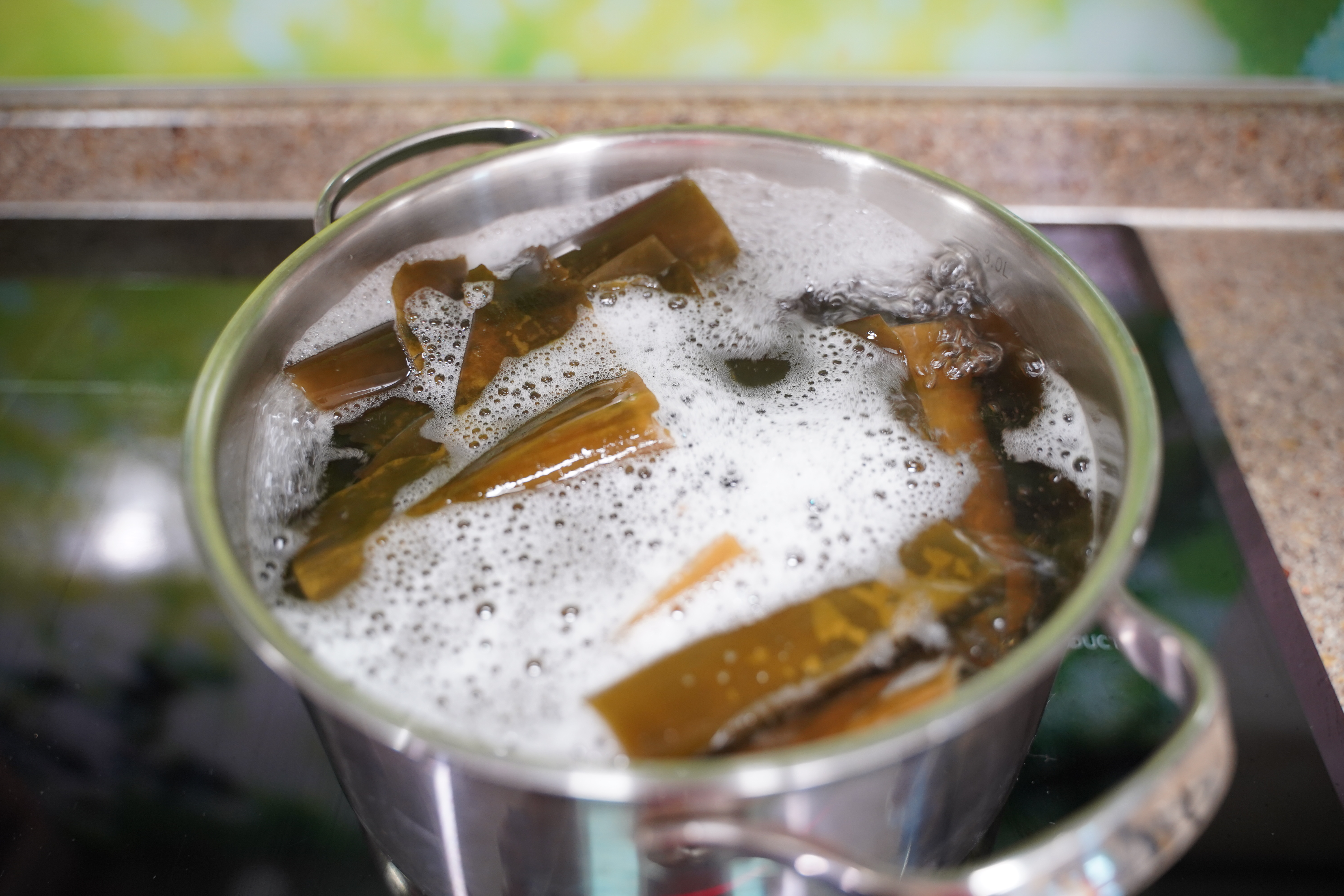 손바닥만한 크기 다시마 7장 깨끗하게 씻어 30분간 2.5리터 물에 담가요.