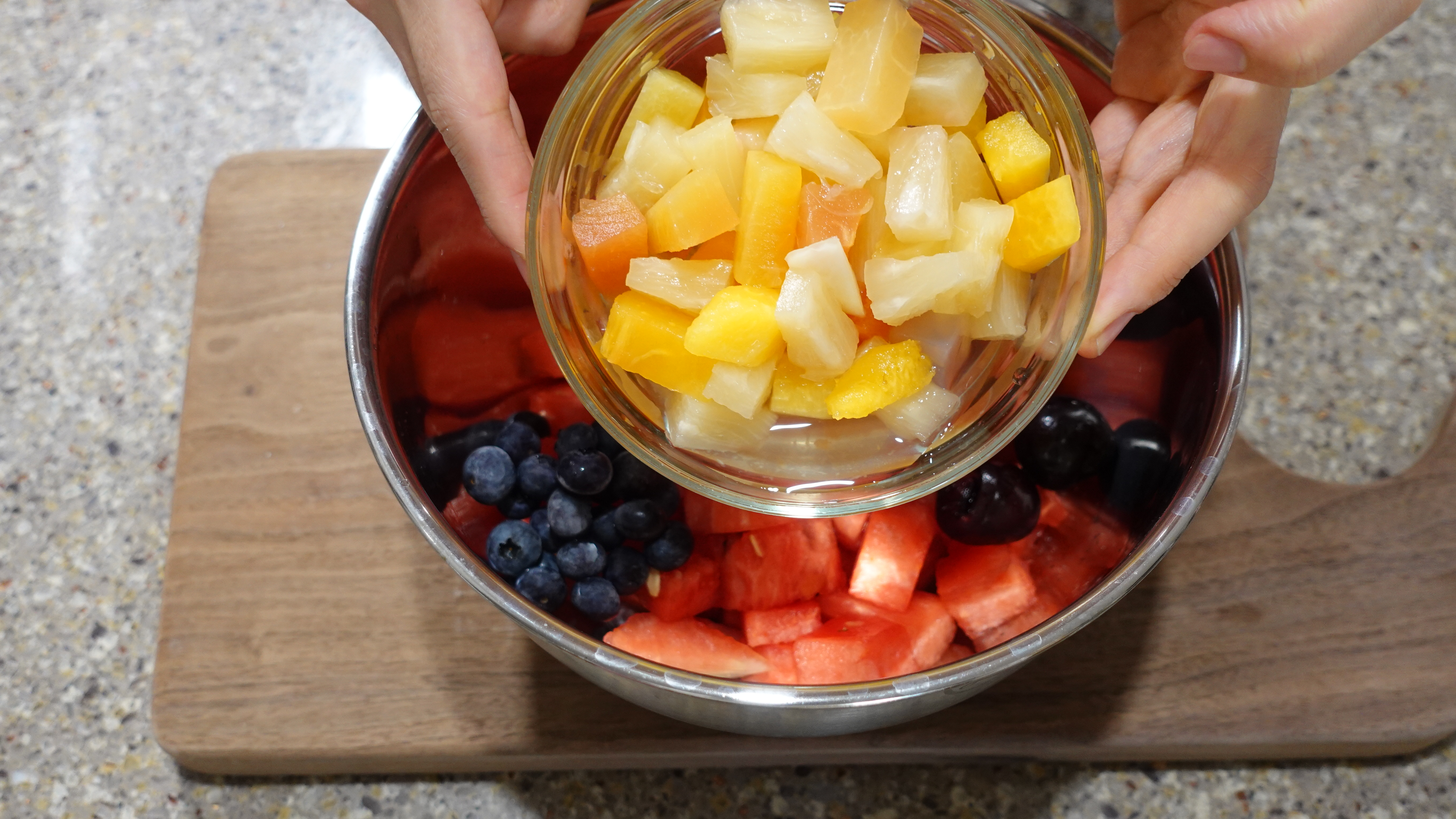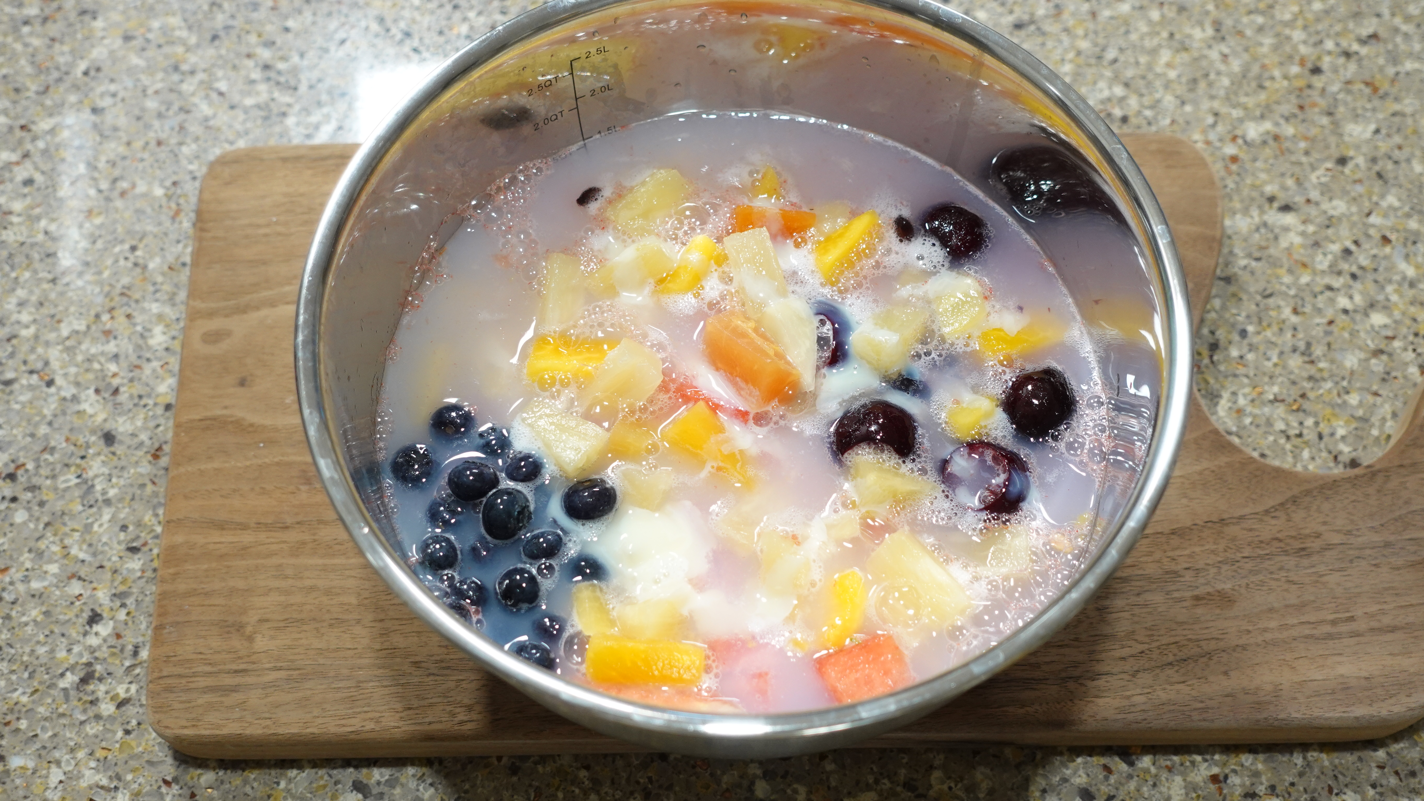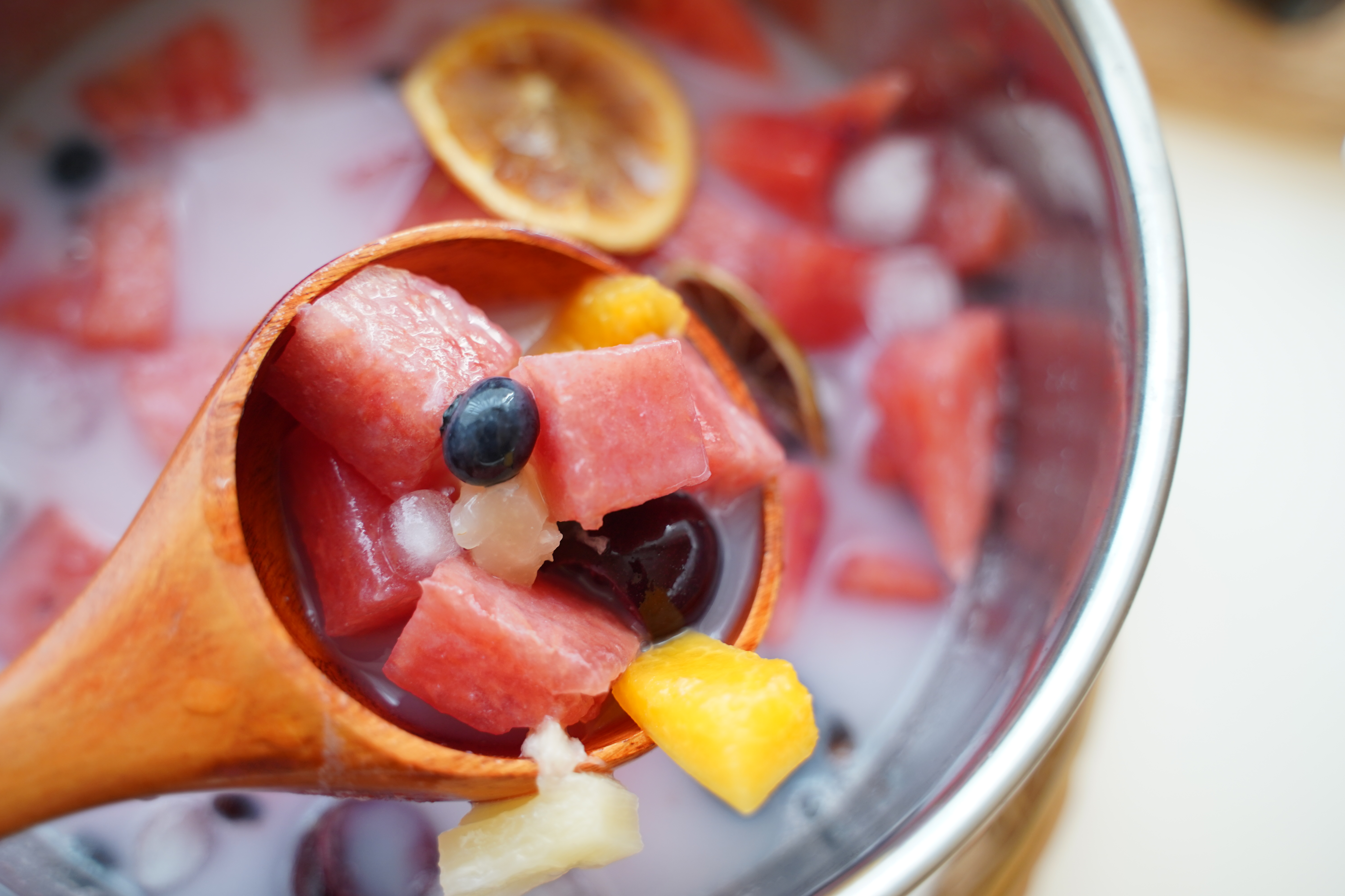 (제가 넣은 과일 외에도 멜론, 키위, 망고, 파인애플, 바나나, 오렌지, 씨 없는 포도 등을 함께 넣어도 괜찮아요. 다만 국물이 들어가면 무르기 쉬운 과일이나 단맛이 너무 강한 과일은 과하게 넣지 않는 게 좋아요. 새콤달콤한 맛과 다양한 식감이 조화를 맞추면 완성도가 확 올라가요~ )