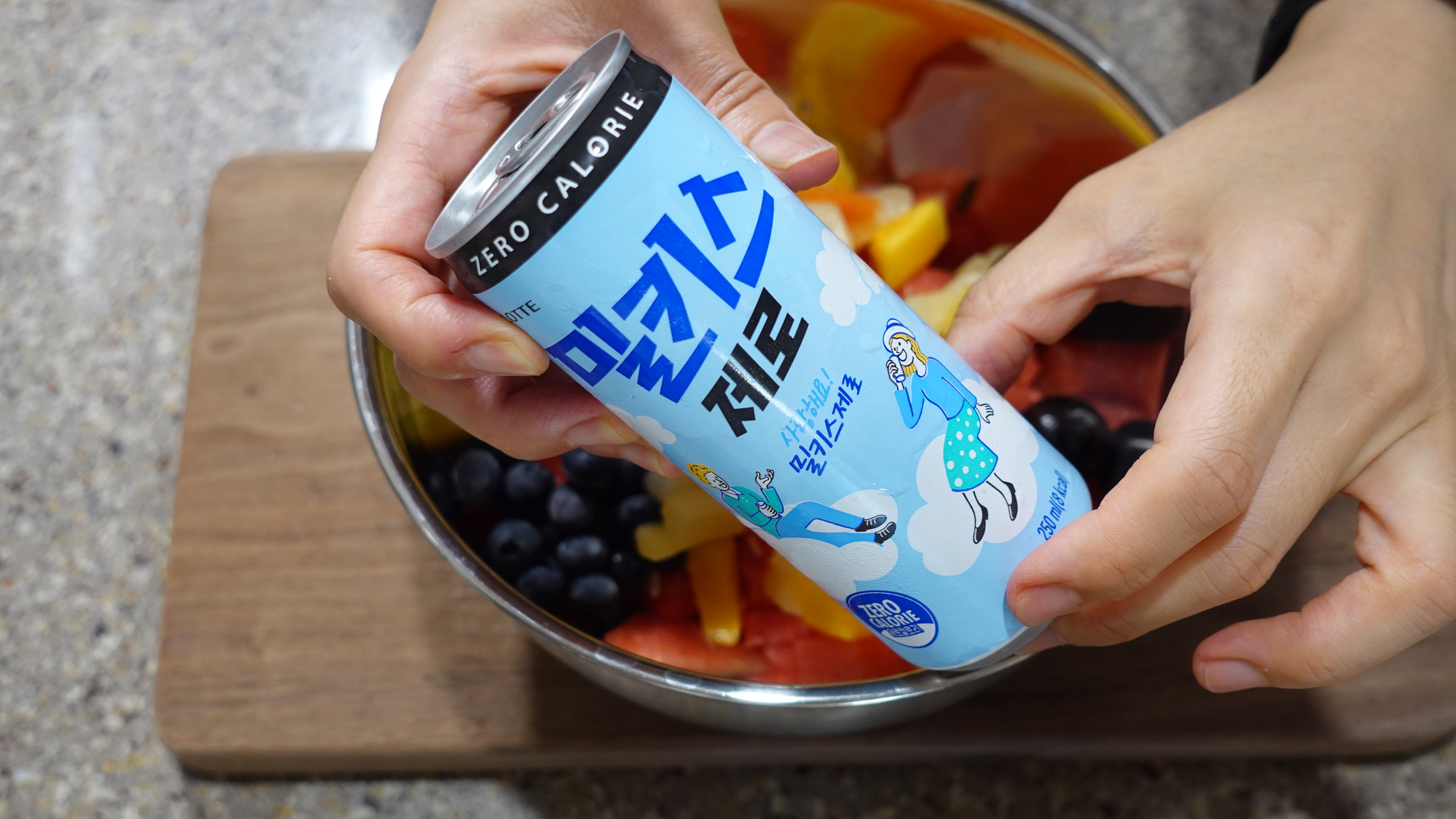 이제 밀키스도 넉넉히 부어주어요. 과일이 잠길 정도로 충분히 부어요~