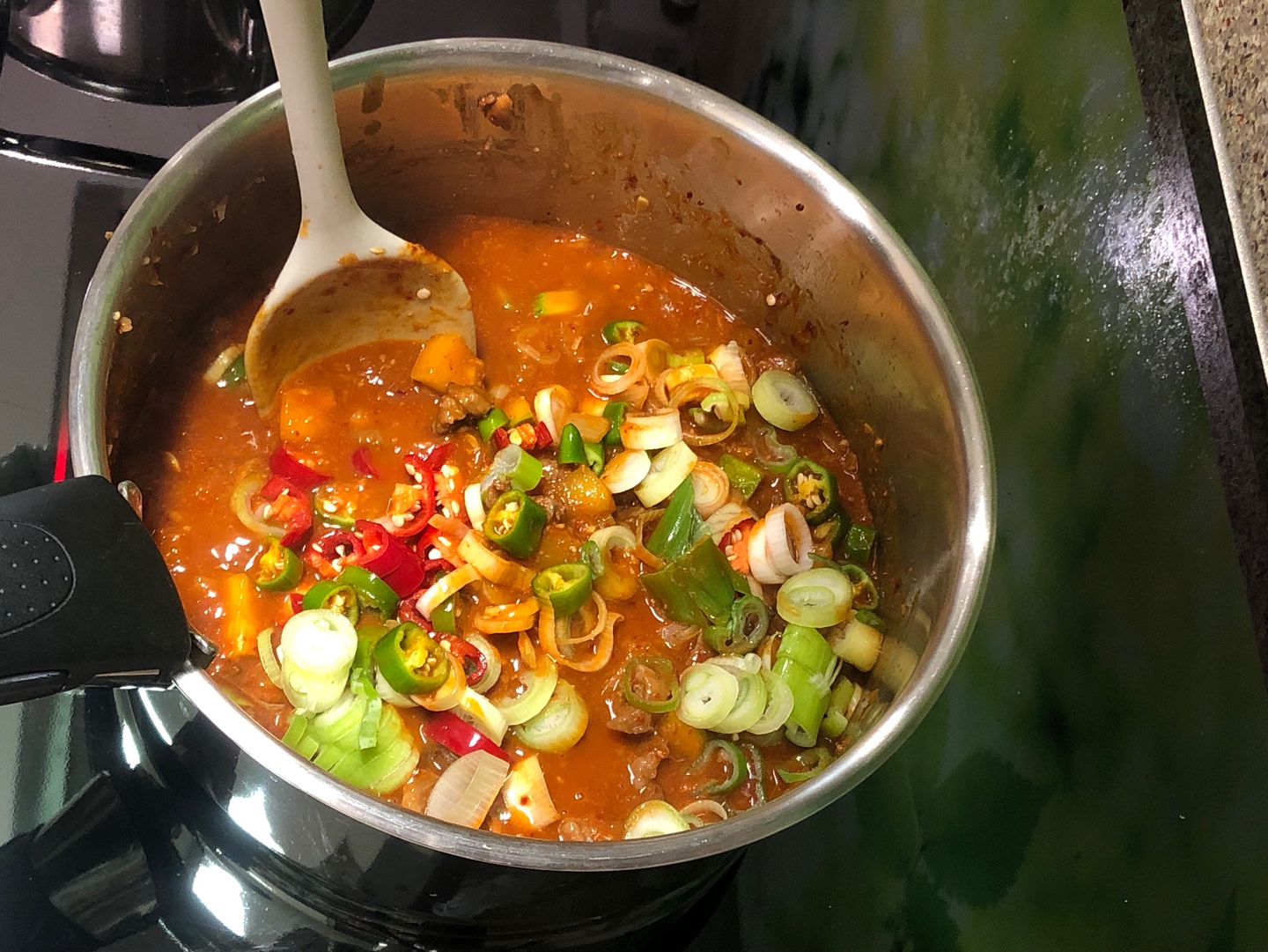 어느 정도 졸여지면 청양고추, 대파, 두부, 표고버섯, 넣고 한번 더 끓여요. 농도 조절하며 육수 조금씩 보충해요.