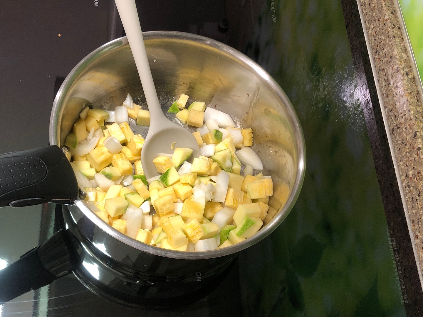 냄비에 참기름 1.5T 두르고 호박과 양파 넣어 살짝 소금간 하며 볶아요.