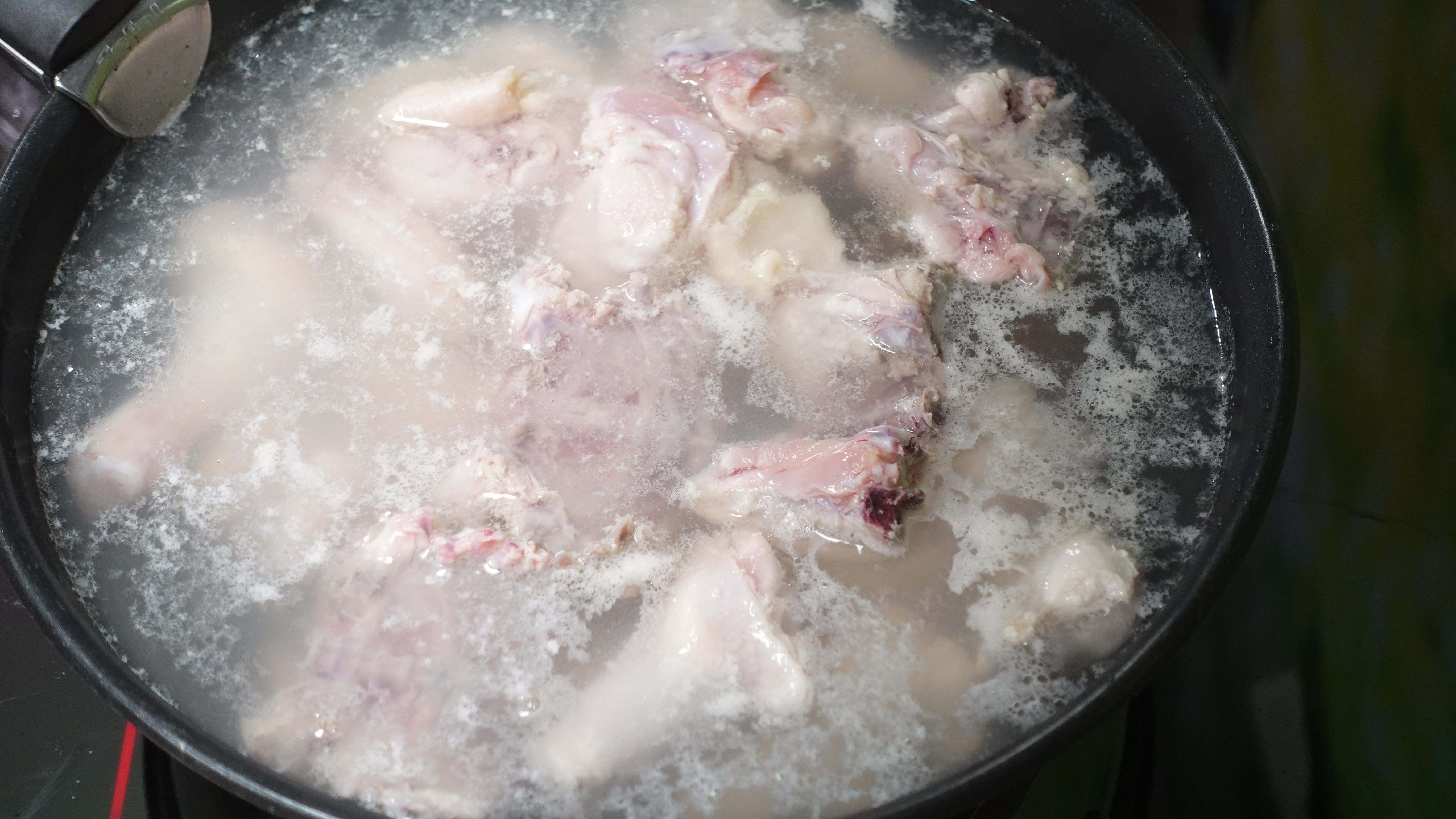 끓는 물에 맛술 3T 넣고 닭을 3분간 데쳐 불순물과 잡내를 제거해요.