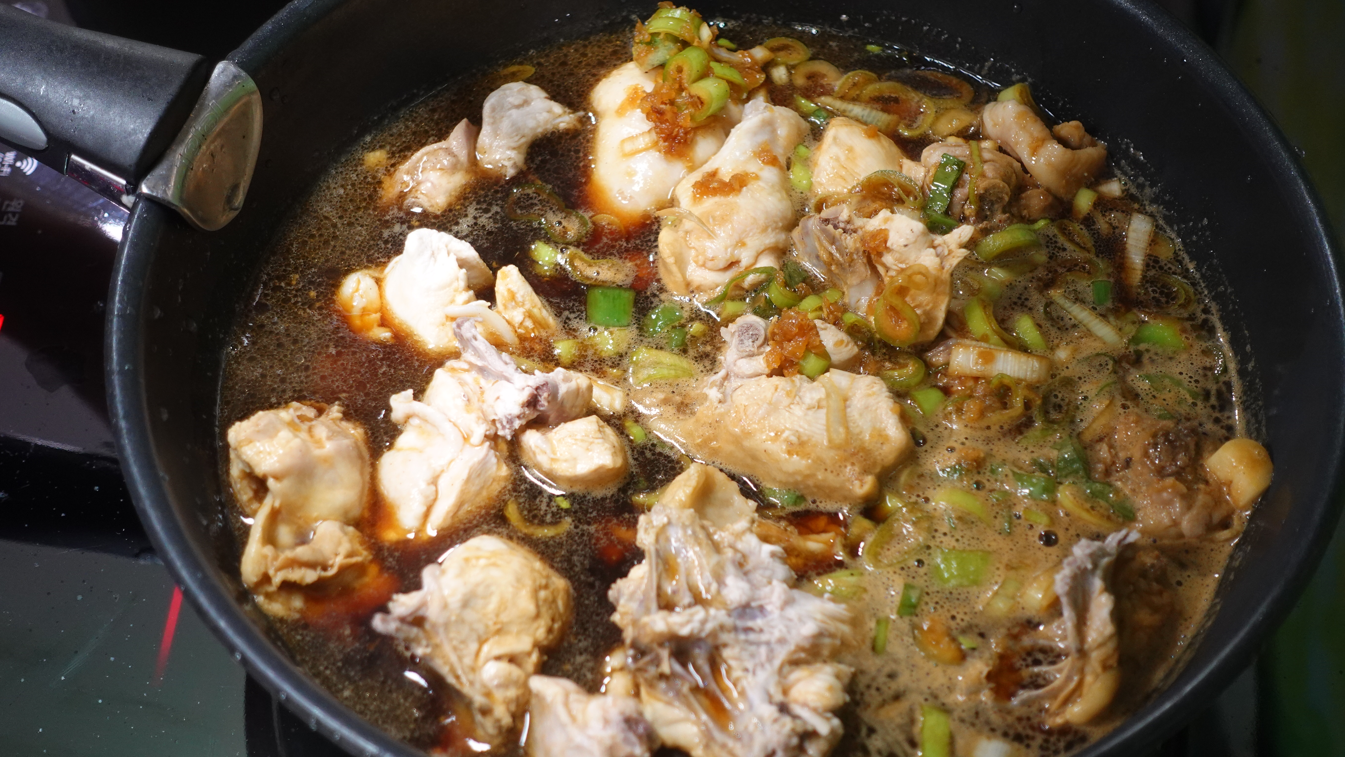 넉넉한 냄비나 웍에 데친닭을 넣고 양념장을 부어요.