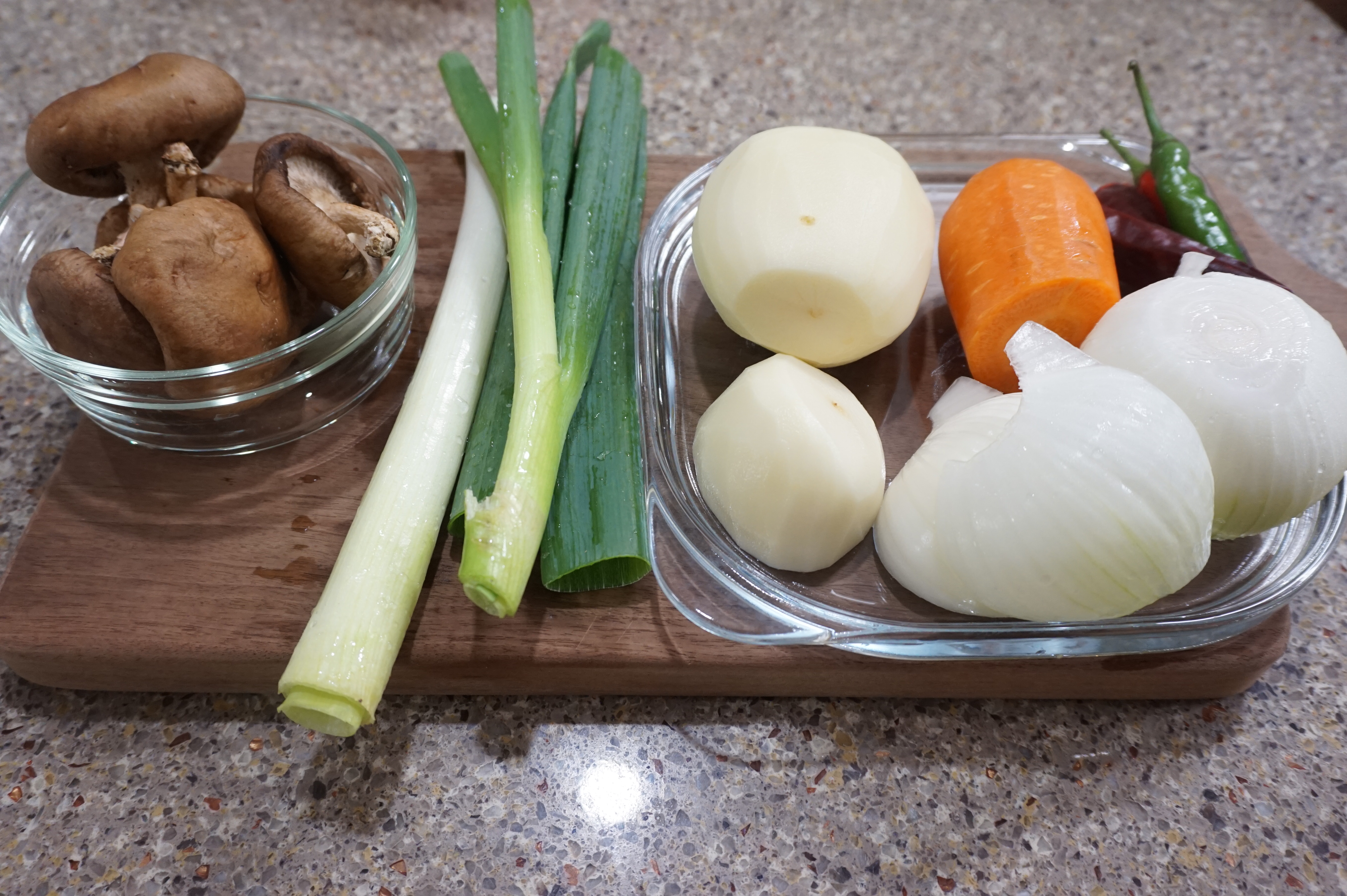 15분 후 감자, 당근, 표고, 양파 넣고 정수 한컵 한번 더 추가 후 감자가 익을 때까지 10분 더 끓여요.