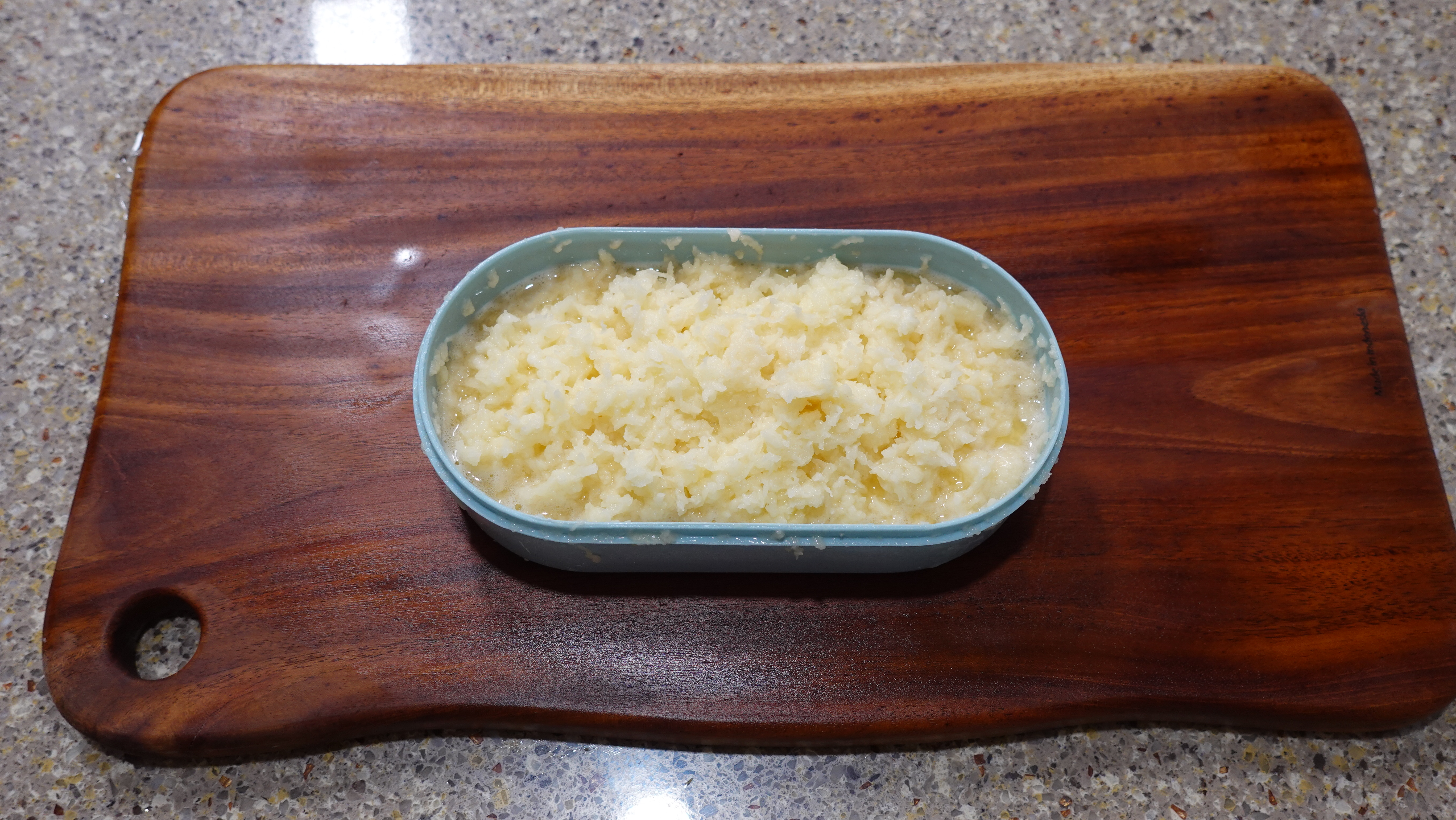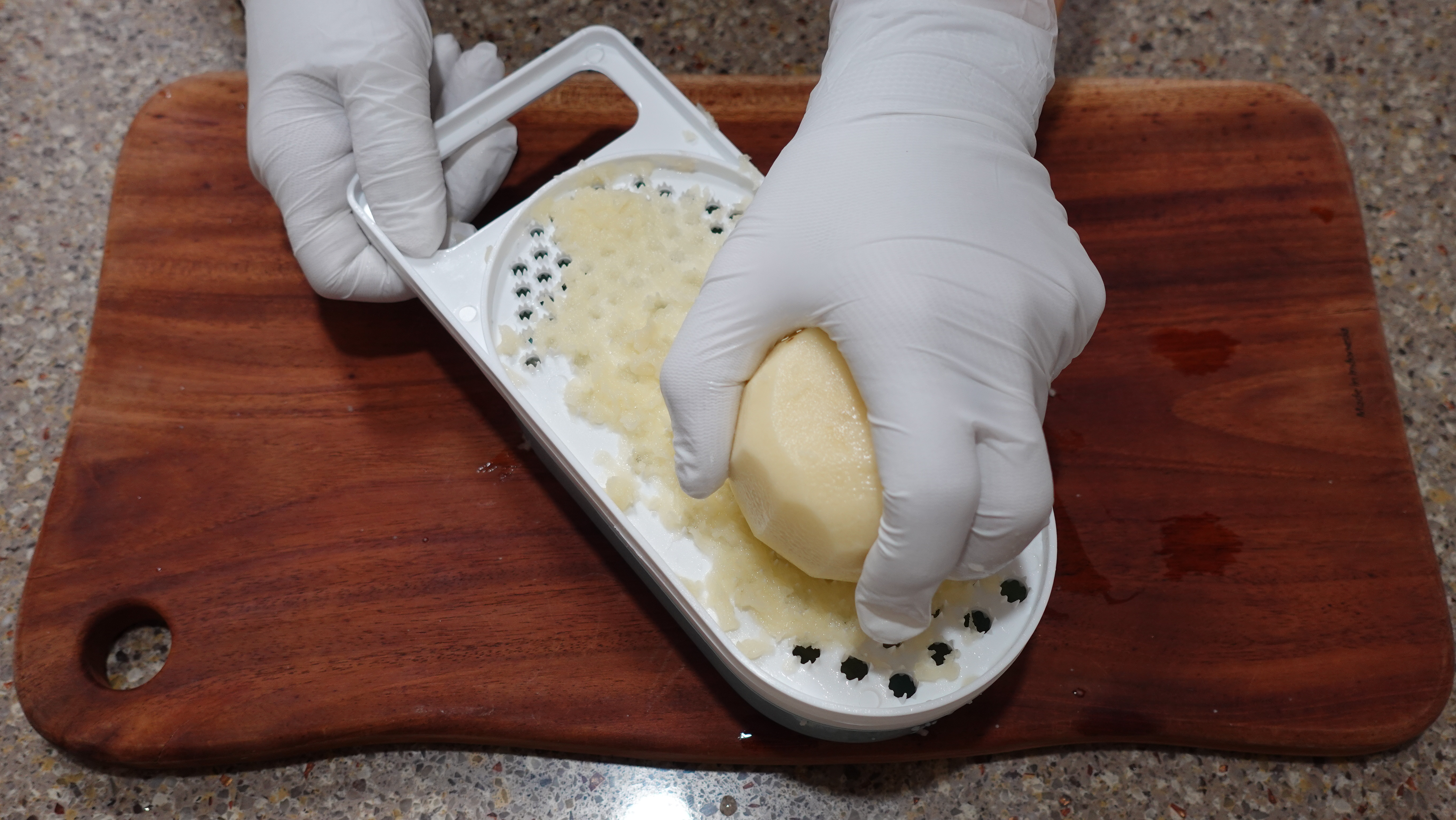 강판에 갈면 감자의 결이 살아있어 전을 부쳤을 때 쫀득한 식감이 더 잘 살아나요. 하나씩 갈면 한통 금방 채울 수 있어요.