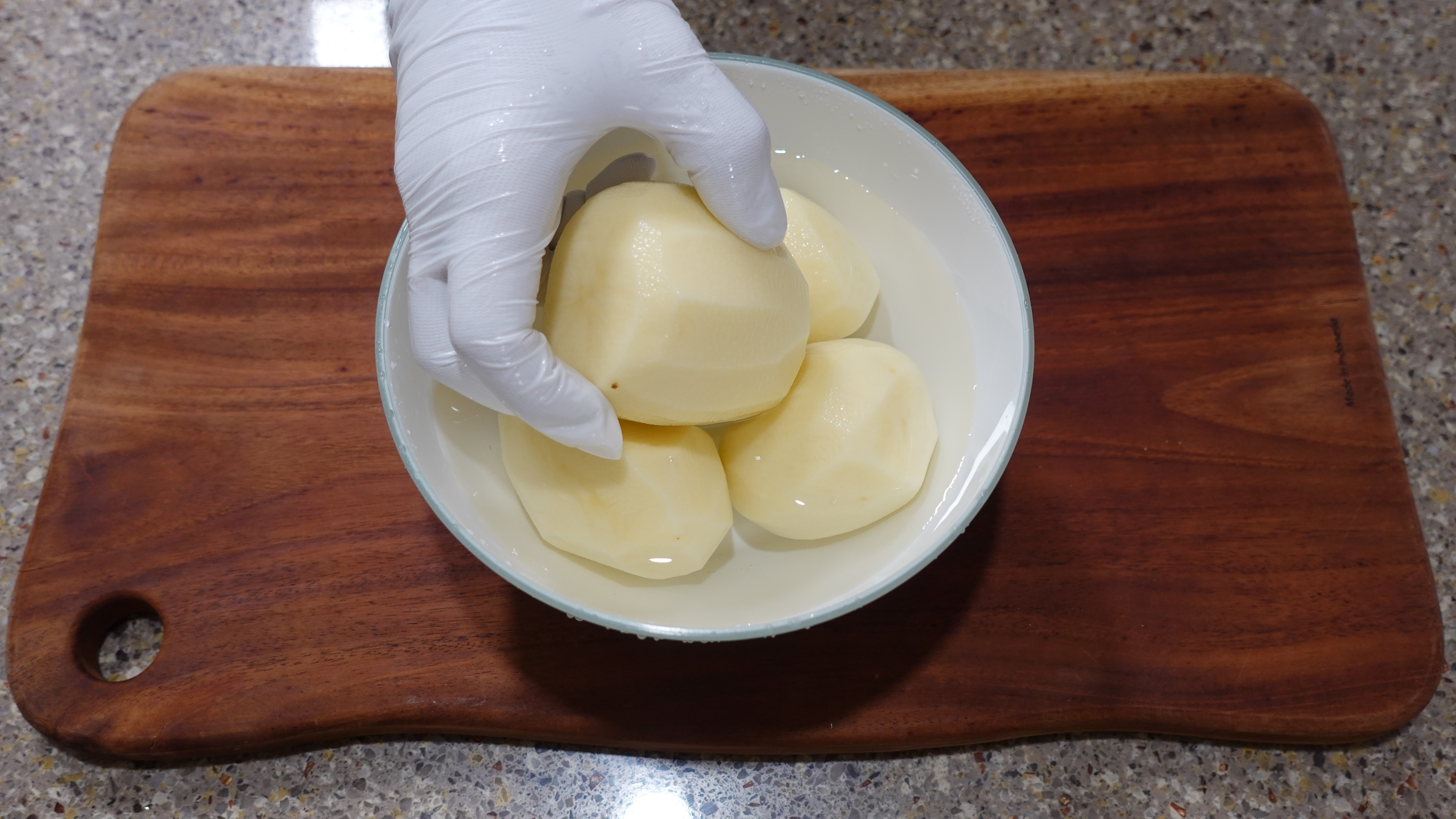 깨끗하게 세척 후 껍질을 벗기고 갈변 방지를 위해 잠깐 물에 담가둡니다.