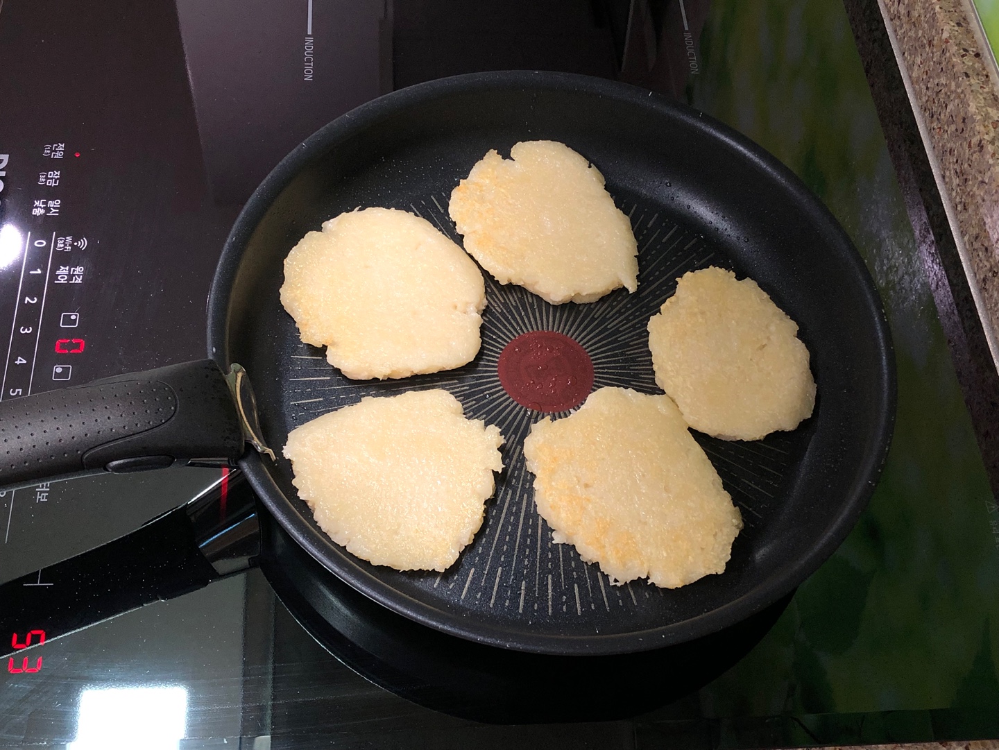 예열한 팬에 식용유를 적당히 두르고 반죽을 한 스푼씩 떠서 동그랗게 모양을 잡으며 부쳐요.