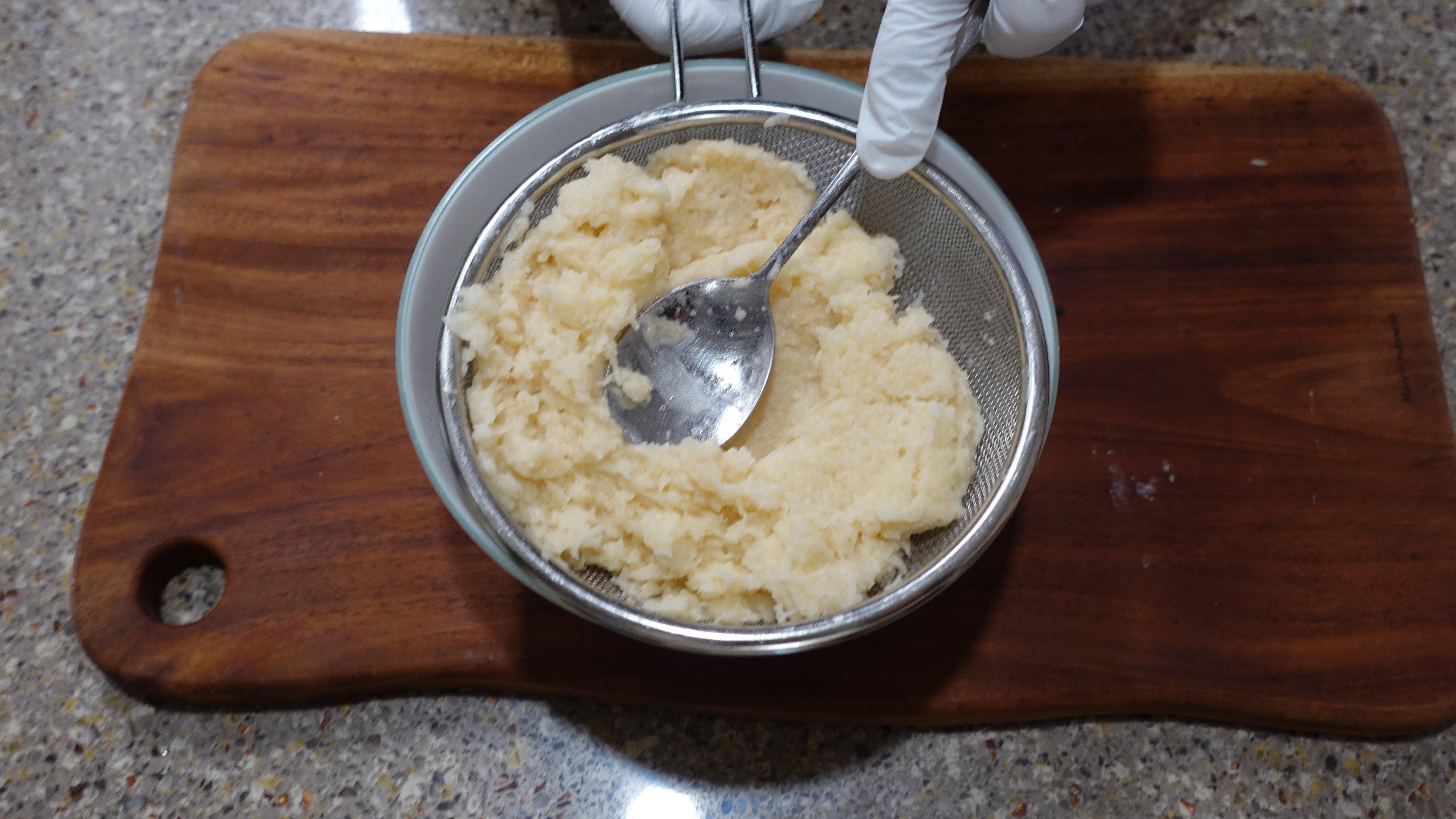 갈은 감자는 체에 밭쳐 꾹꾹 눌러 물기를 제거해요.