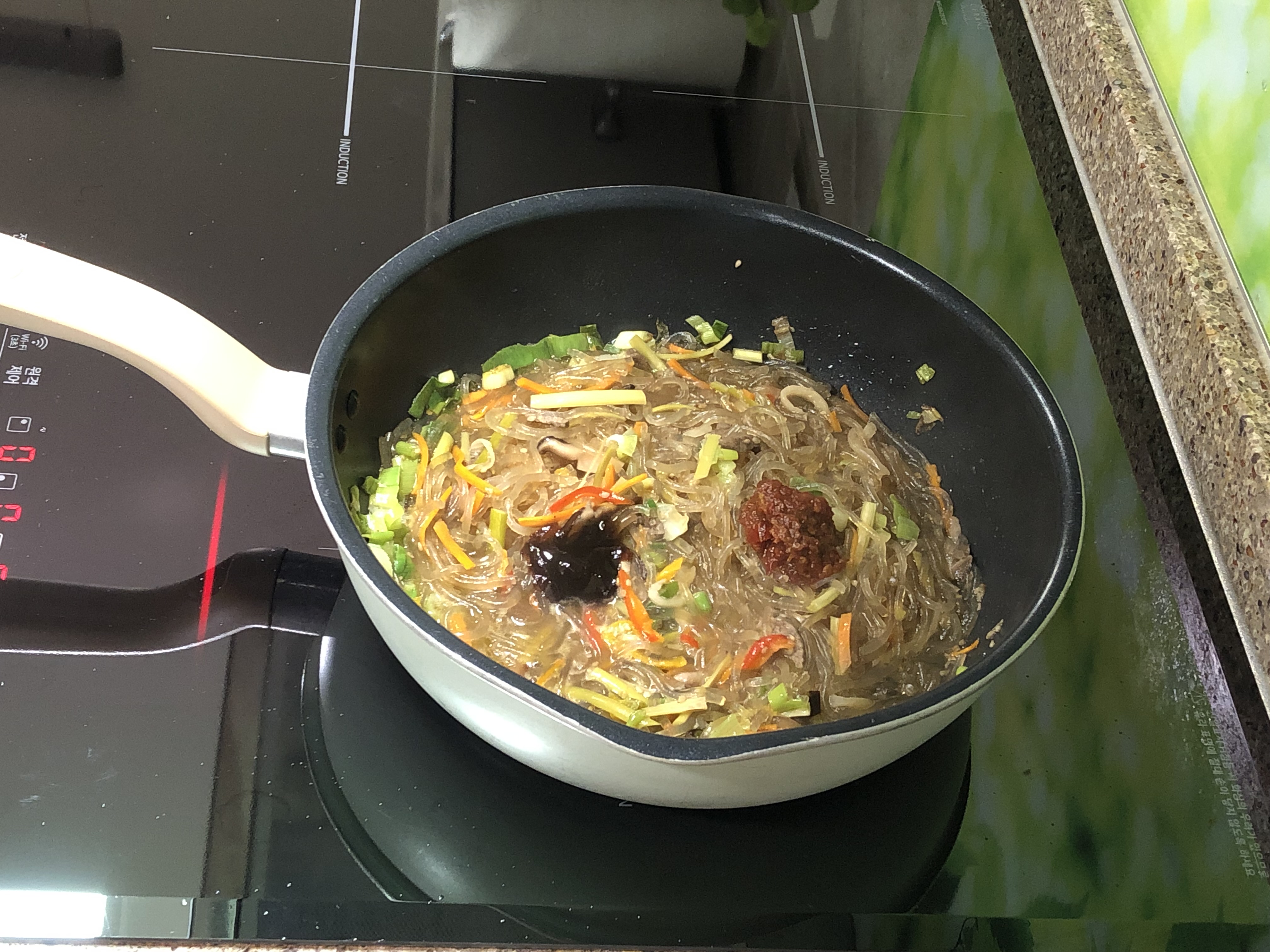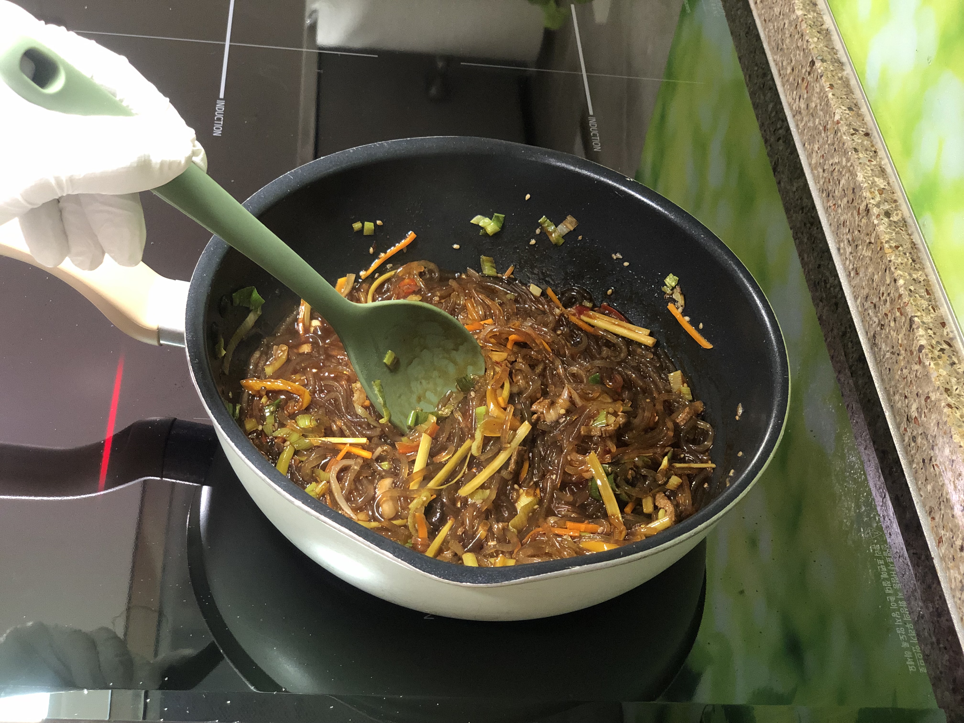 파 향이 솔솔 올라오면 먹기좋게 자른 잡채와 물 100ml를 넣고 볶아요. 당면이 부드럽게 풀리면서 촉촉해집니다.