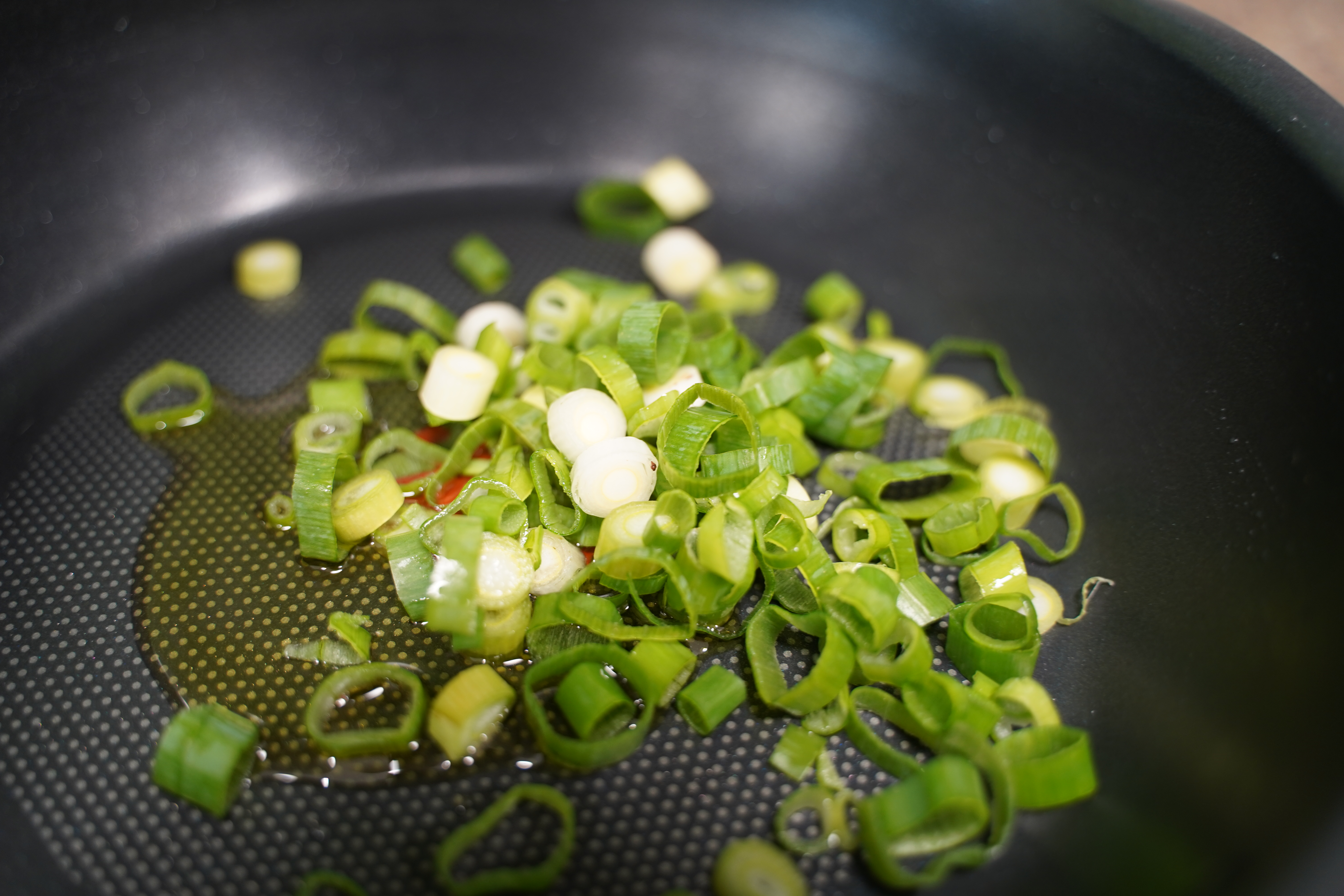 팬에 식용유를 두르고 송송 썬 파를 약불에서 볶아요.