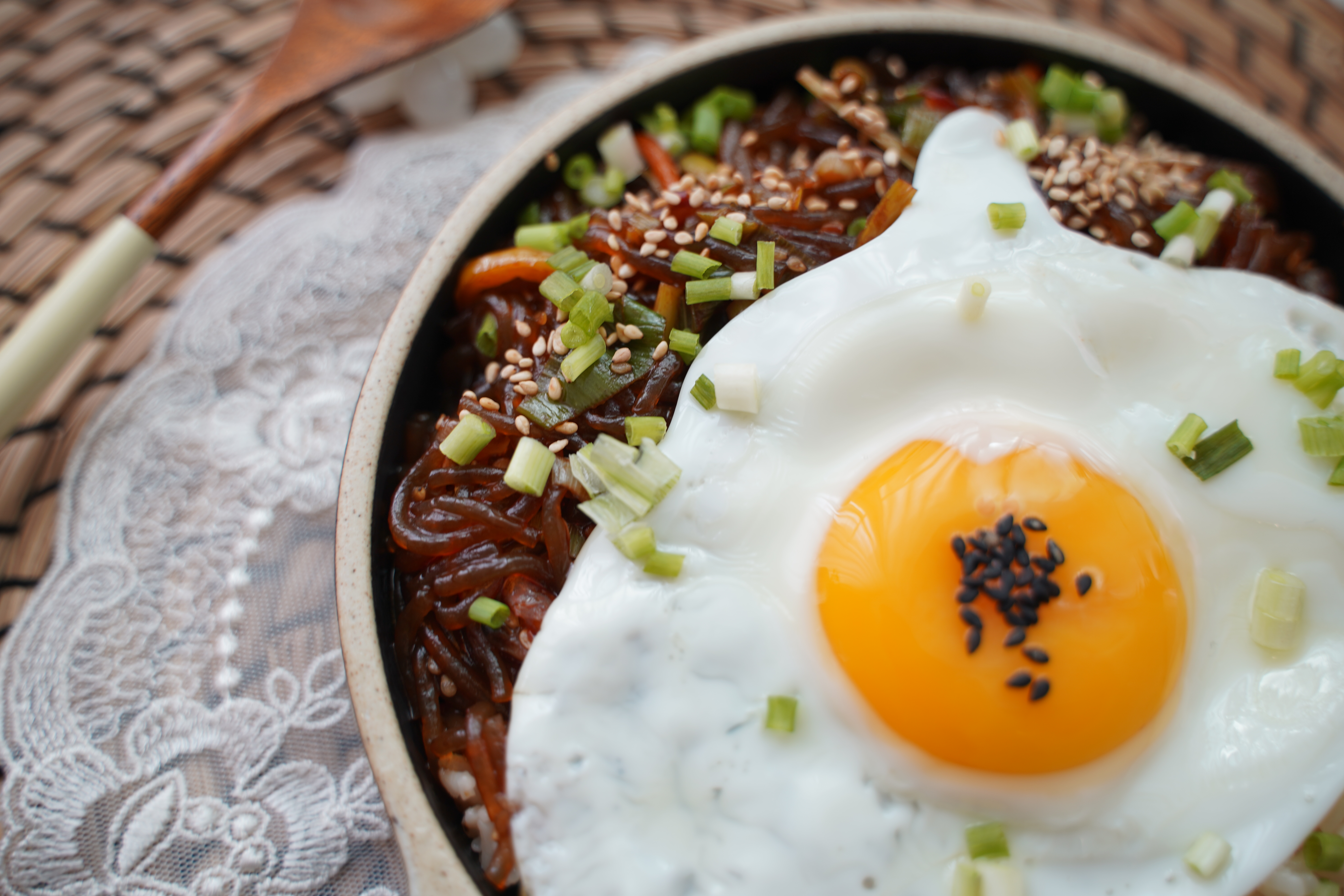 고슬고슬한 밥과 볶은 잡채를 그릇에 반반씩 담고, 계란 후라이도 하나 올리면 중국집 잡채밥 부럽지 않은 나만의 잡채밥 만들기 완성!