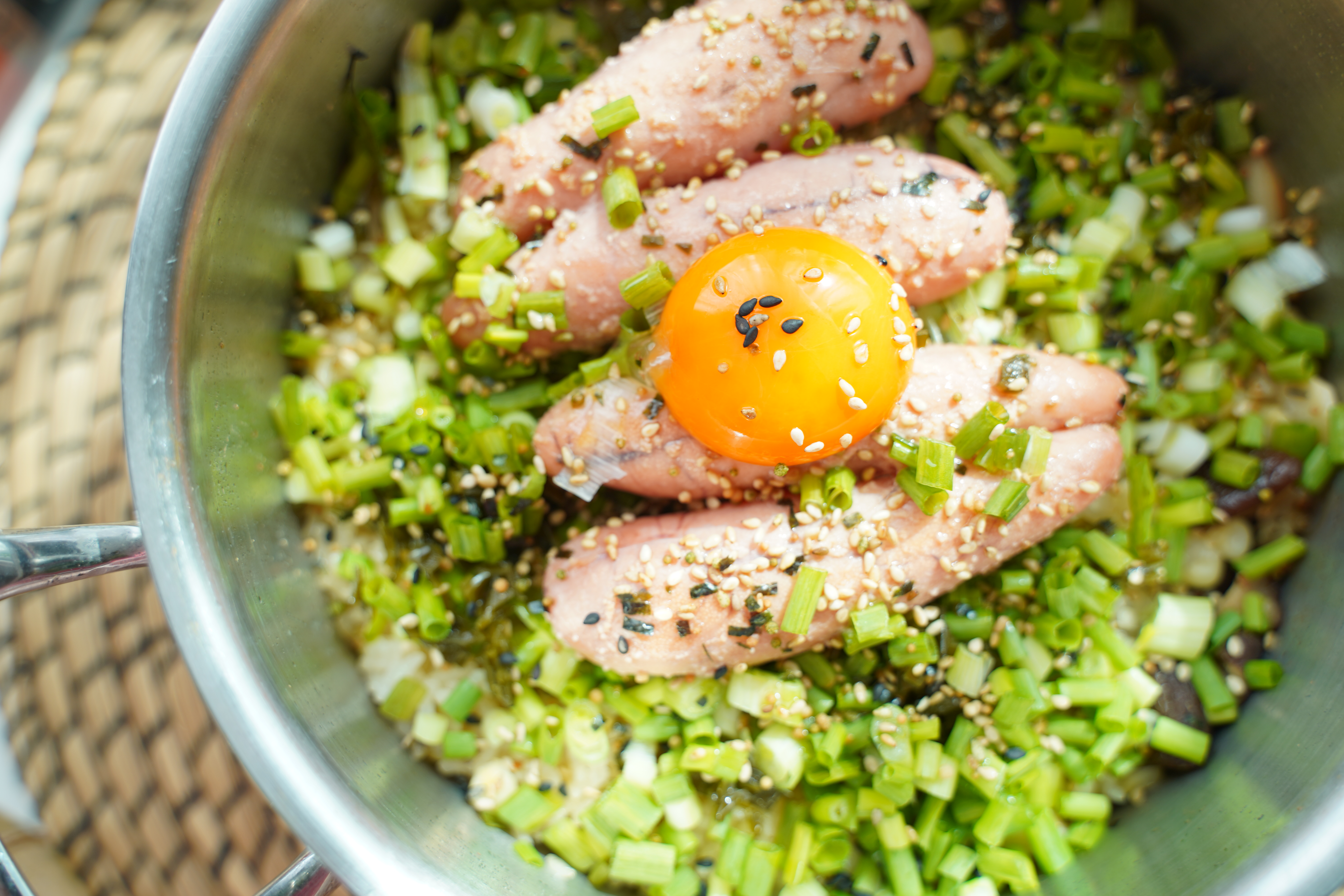 10분 후 뚜껑 열고 쪽파, 구운 명란, 잘게 썬 다시마 올리고 뚜껑 닫아 5분간 더 뜸 들여요.