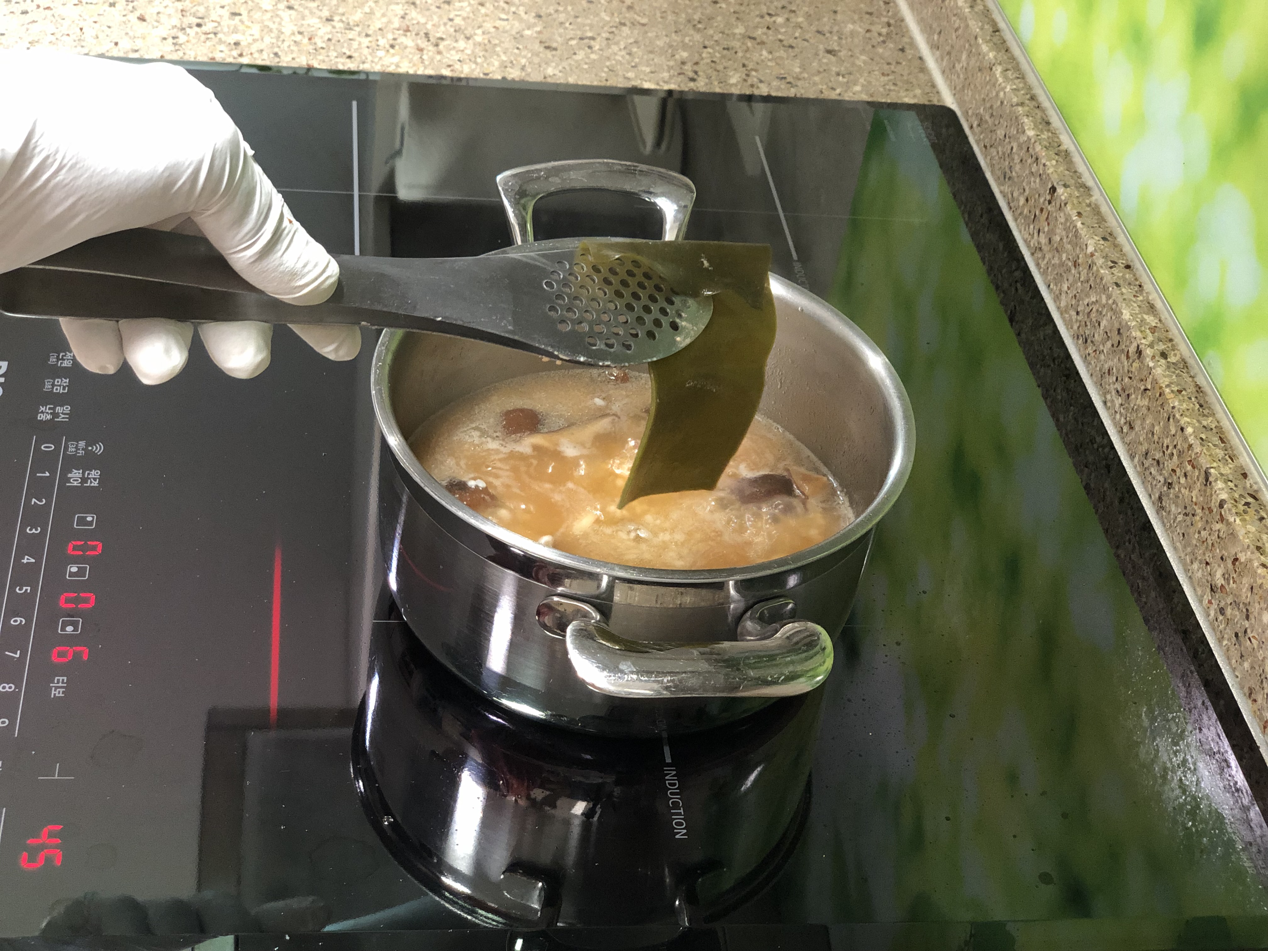 물이 끓고 김이 올라오기 시작하면 약불로 줄이고 다시마는 건져내요.