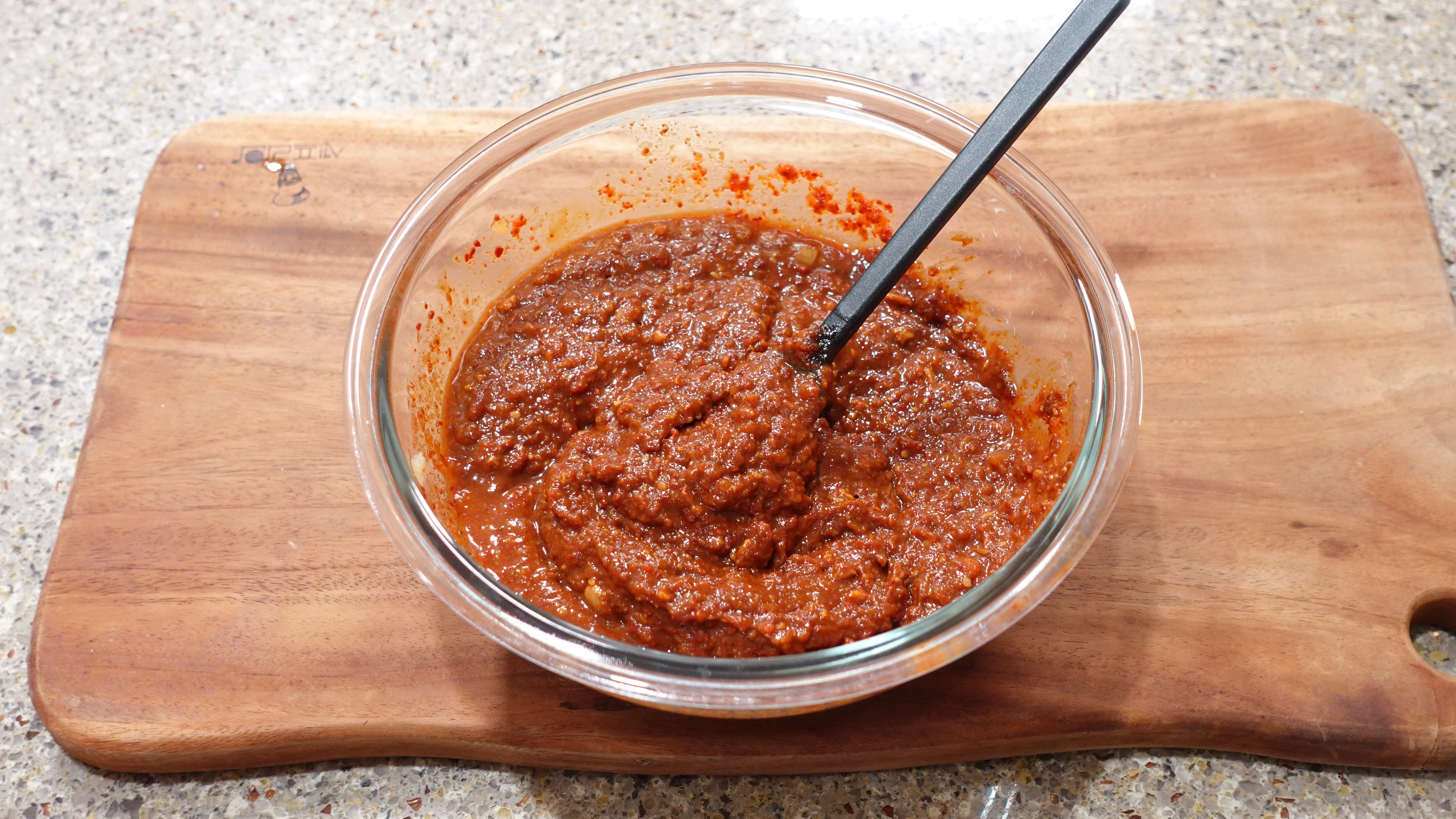 볼에 된장 6T, 고추장 2T, 고춧가루 4T, 다진 마늘 3T, 다진 생강 1T, 참치액 2T, 육수 1 국자 (약 100ml) 넣어 잘 섞어요. 양념장이 고루 섞이면 준비 완료!