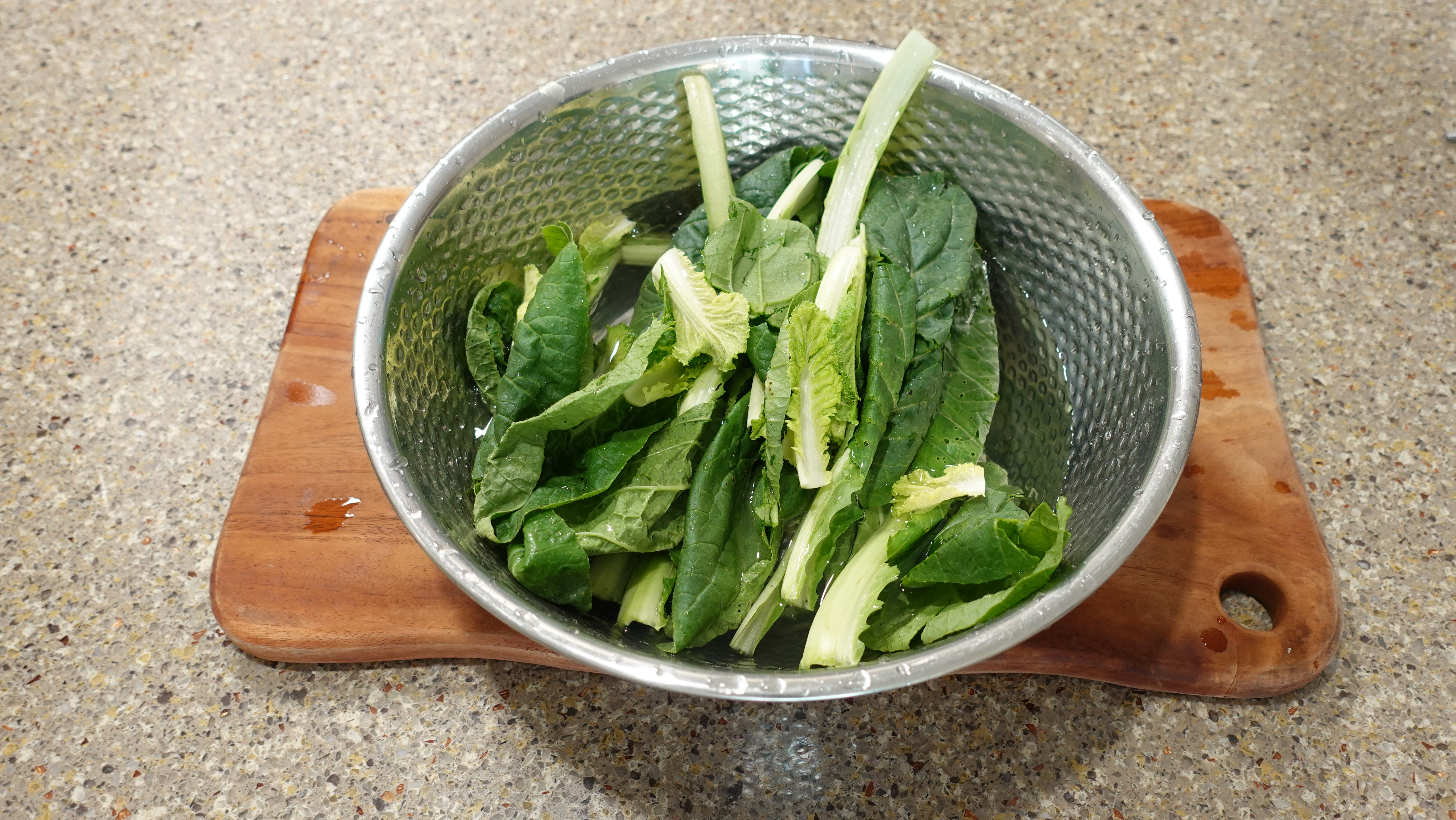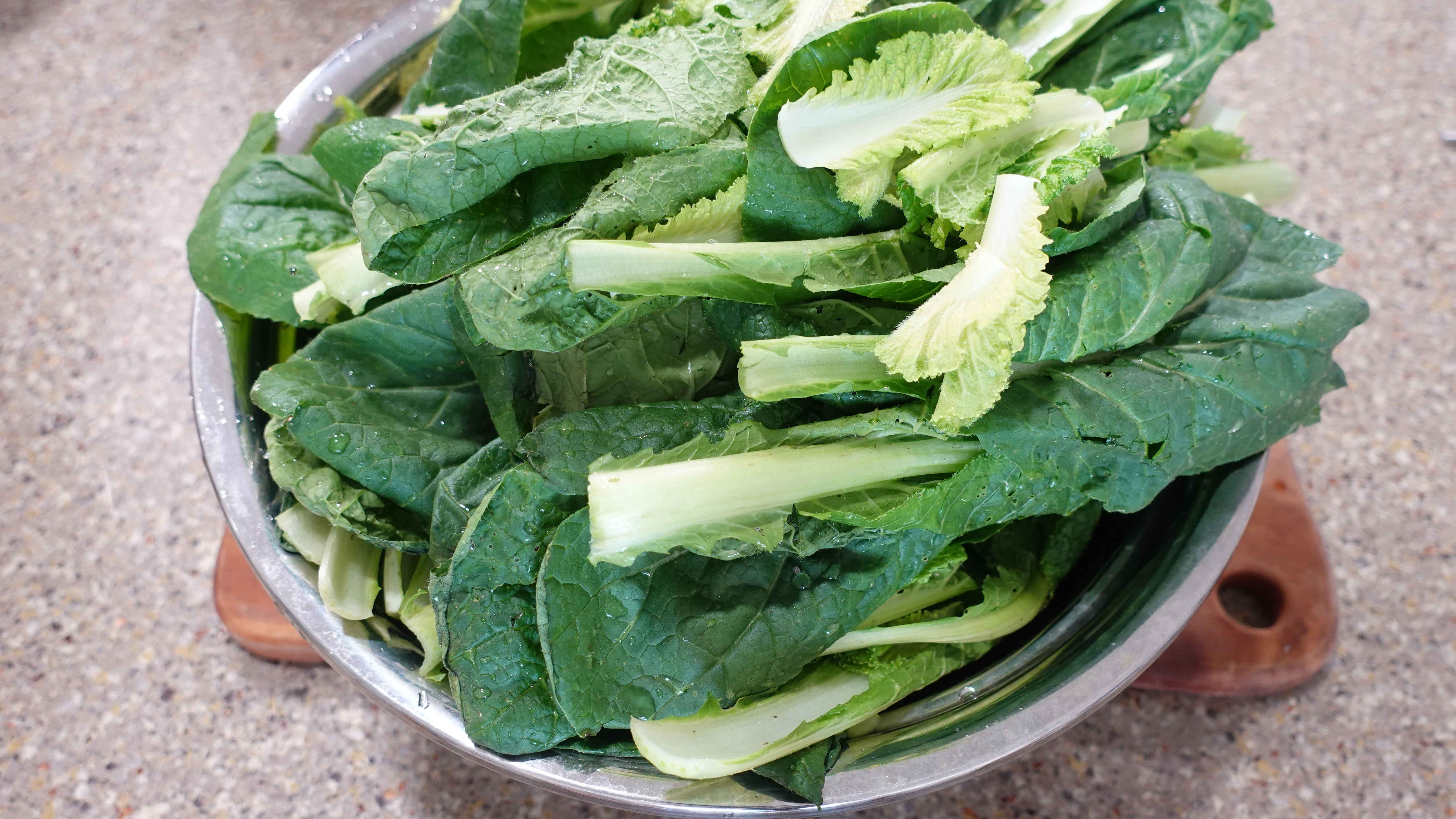 얼갈이의 시든 잎은 떼어내고 밑동을 잘라 깨끗하게 씻어요.