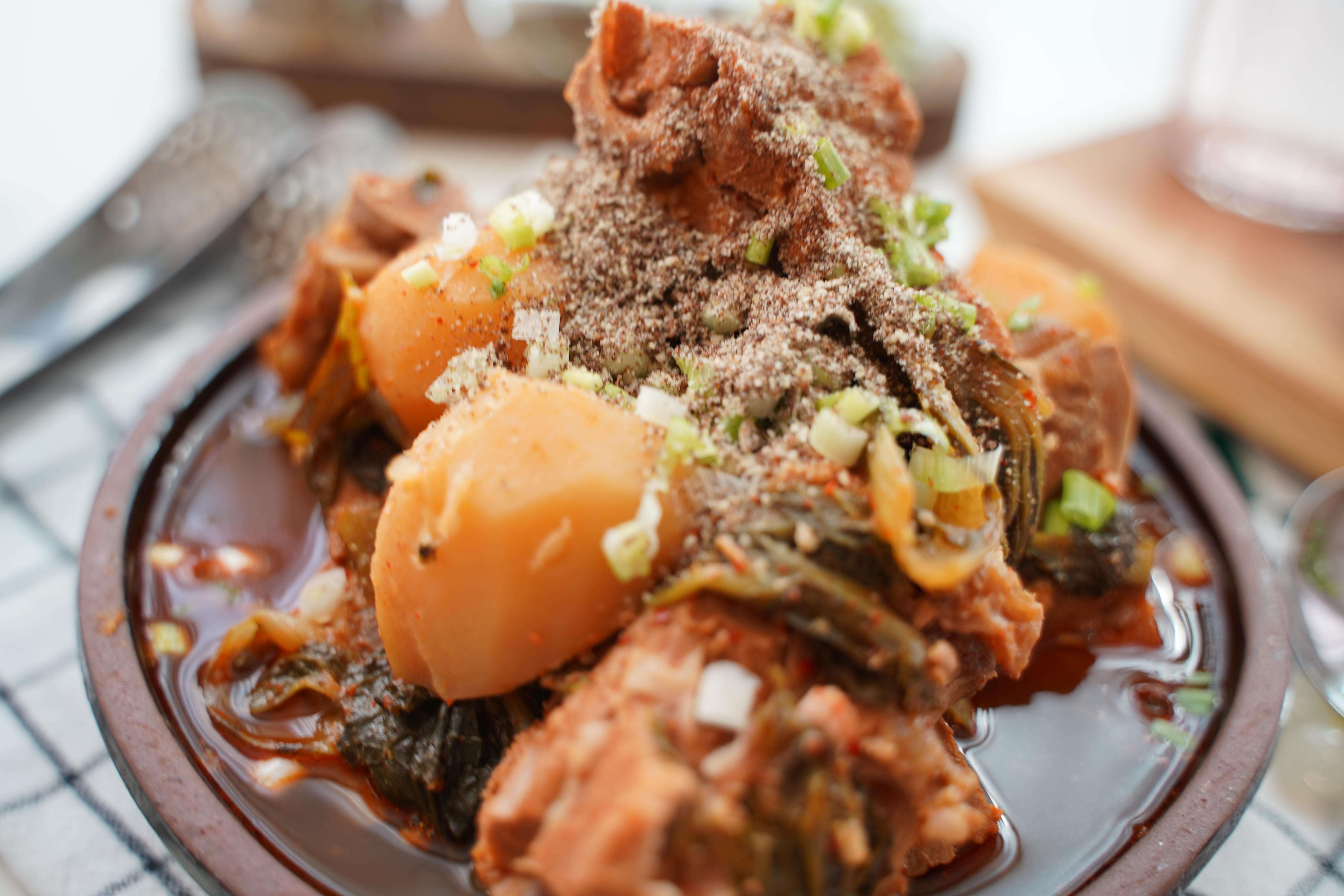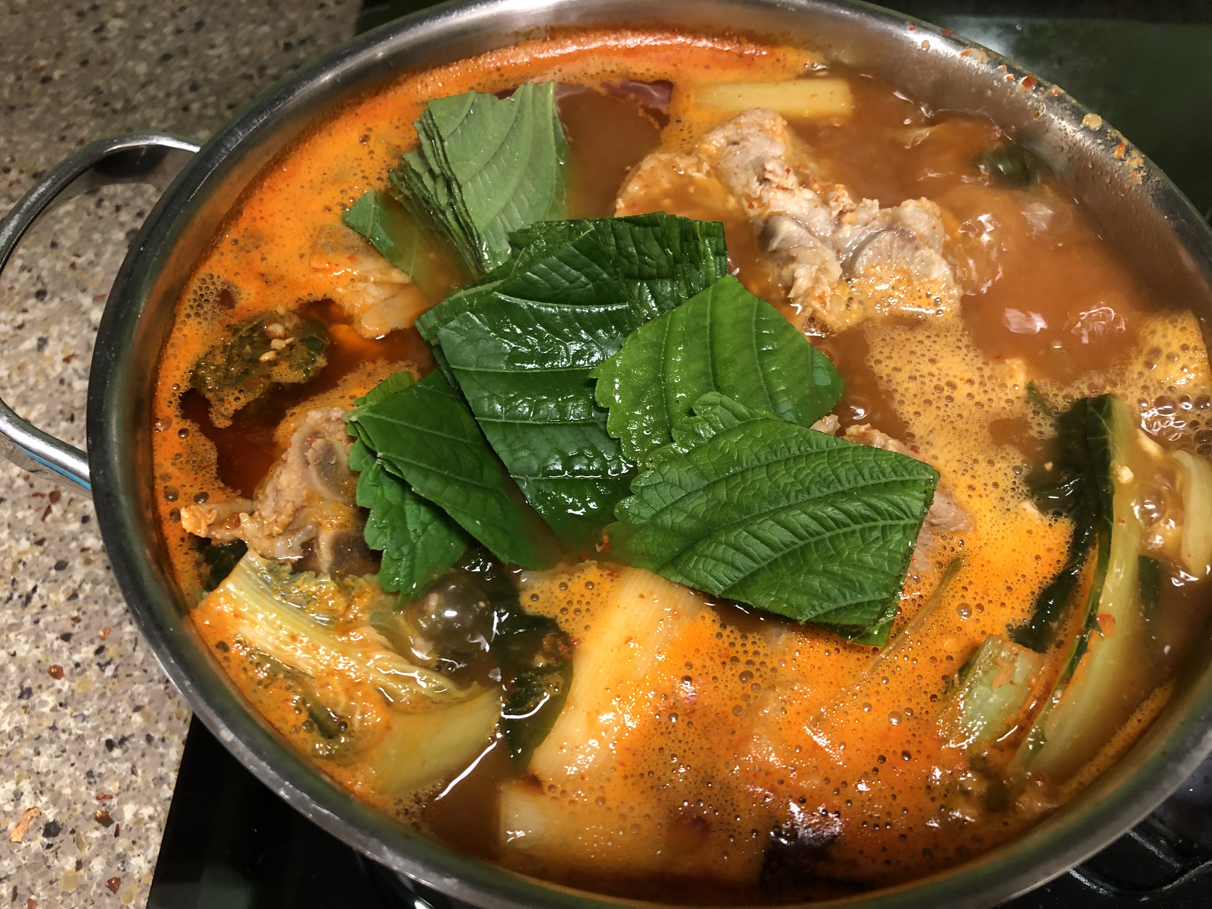 감자, 얼갈이, 깻잎을 듬뿍 넣어 칼칼하면서 깊은 맛이 나는 등뼈해장국 스타일입니다.