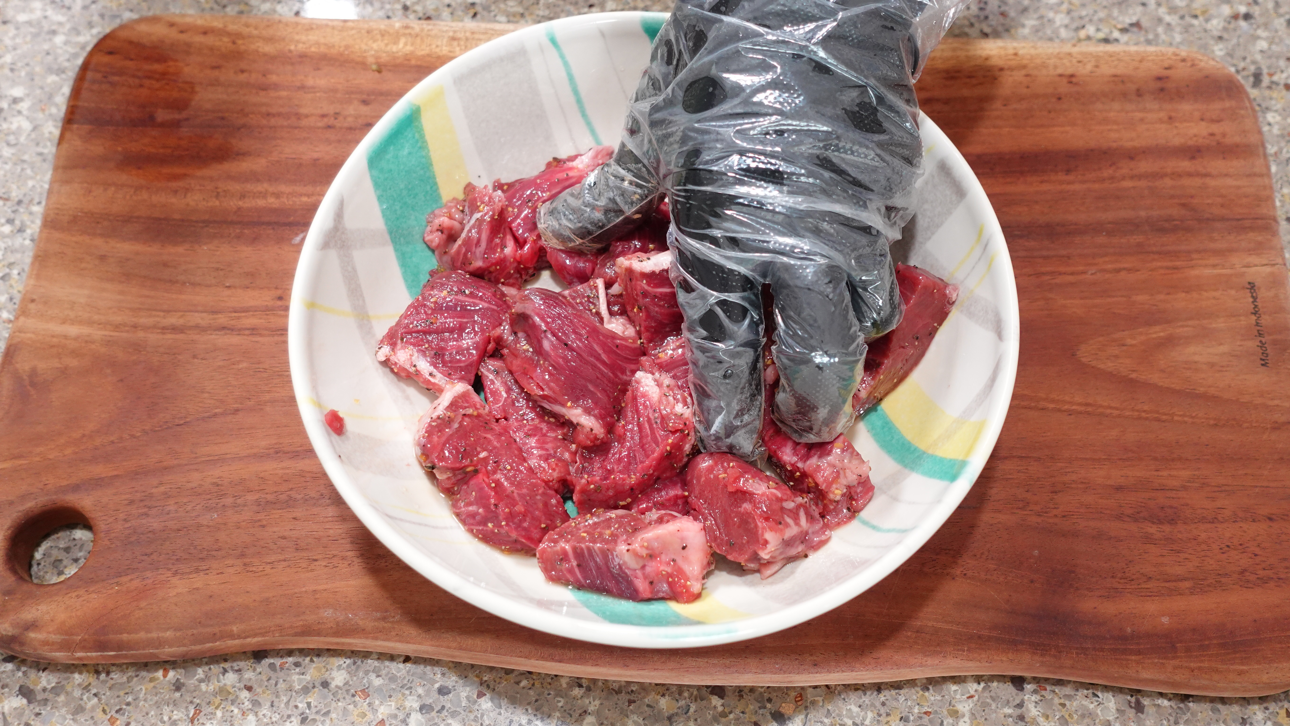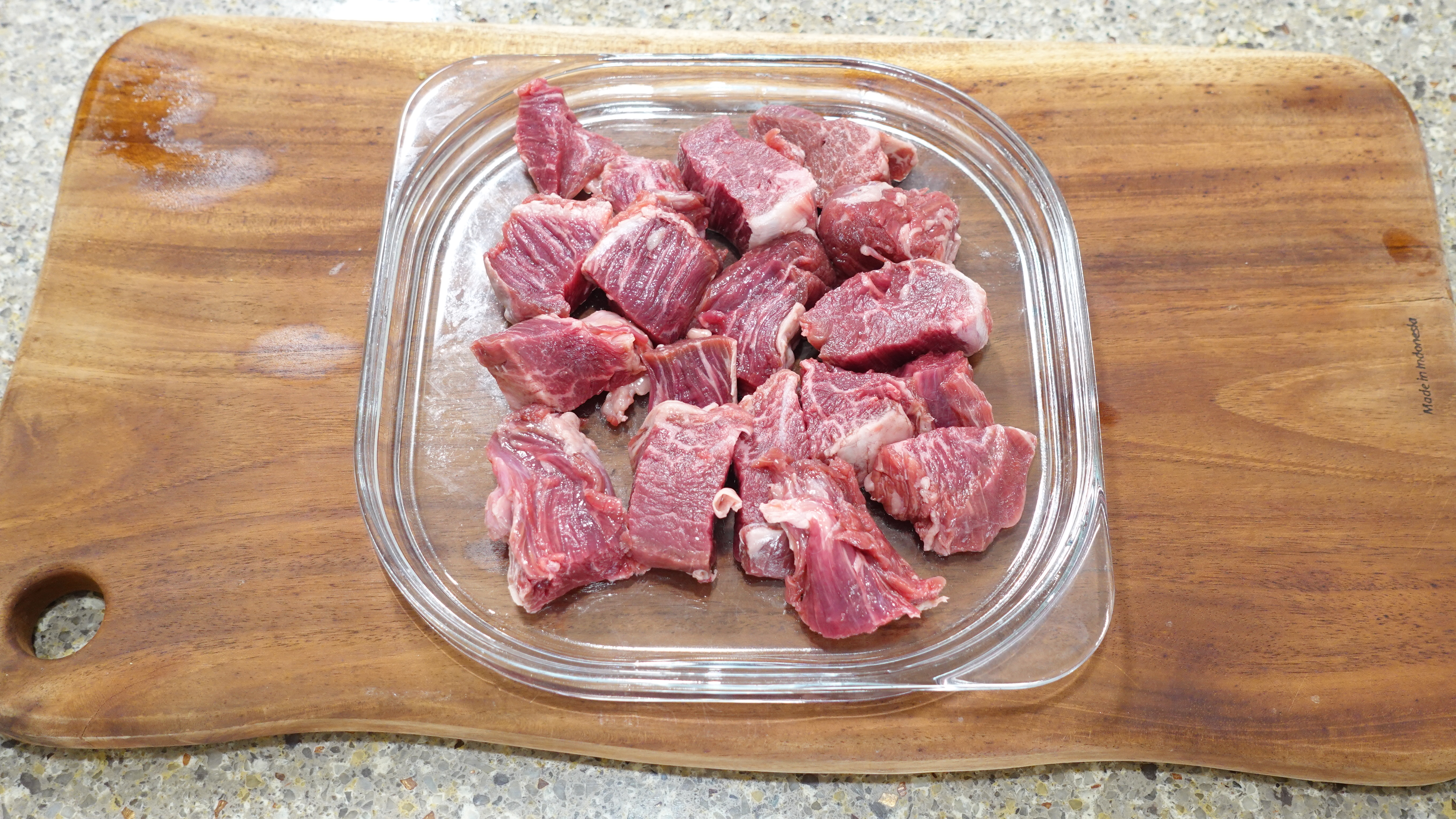 핏물 제거 후엔 먹기 좋은 크기로 썰어요. 구우면 크기가 줄어드니 조금 넉넉한 크기로 써는 게 좋아요.