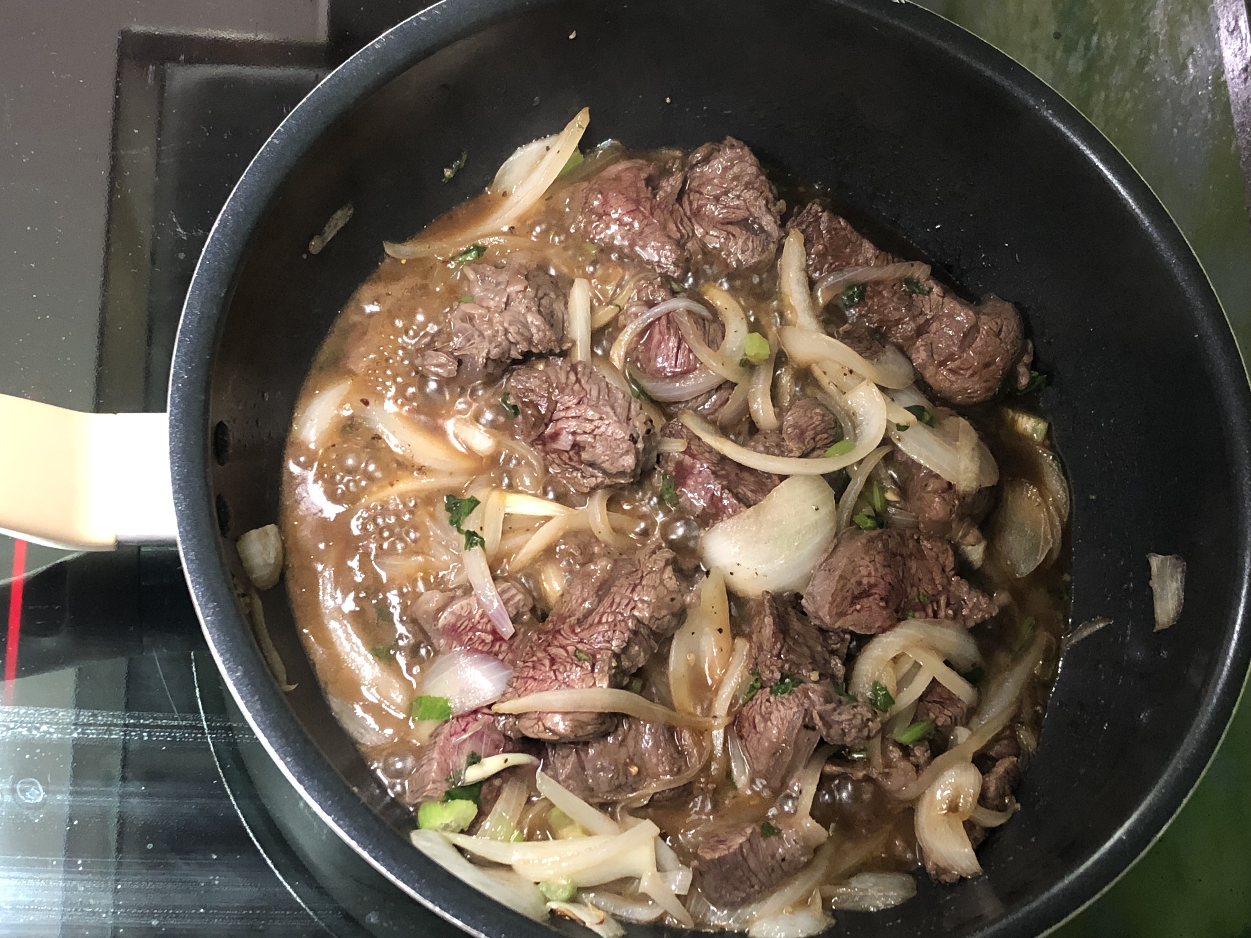 고기가 반쯤 익으면 셀러리를 넣고 조금 전 만든 소스를 부은 뒤 자작하게 졸이듯 볶아요.