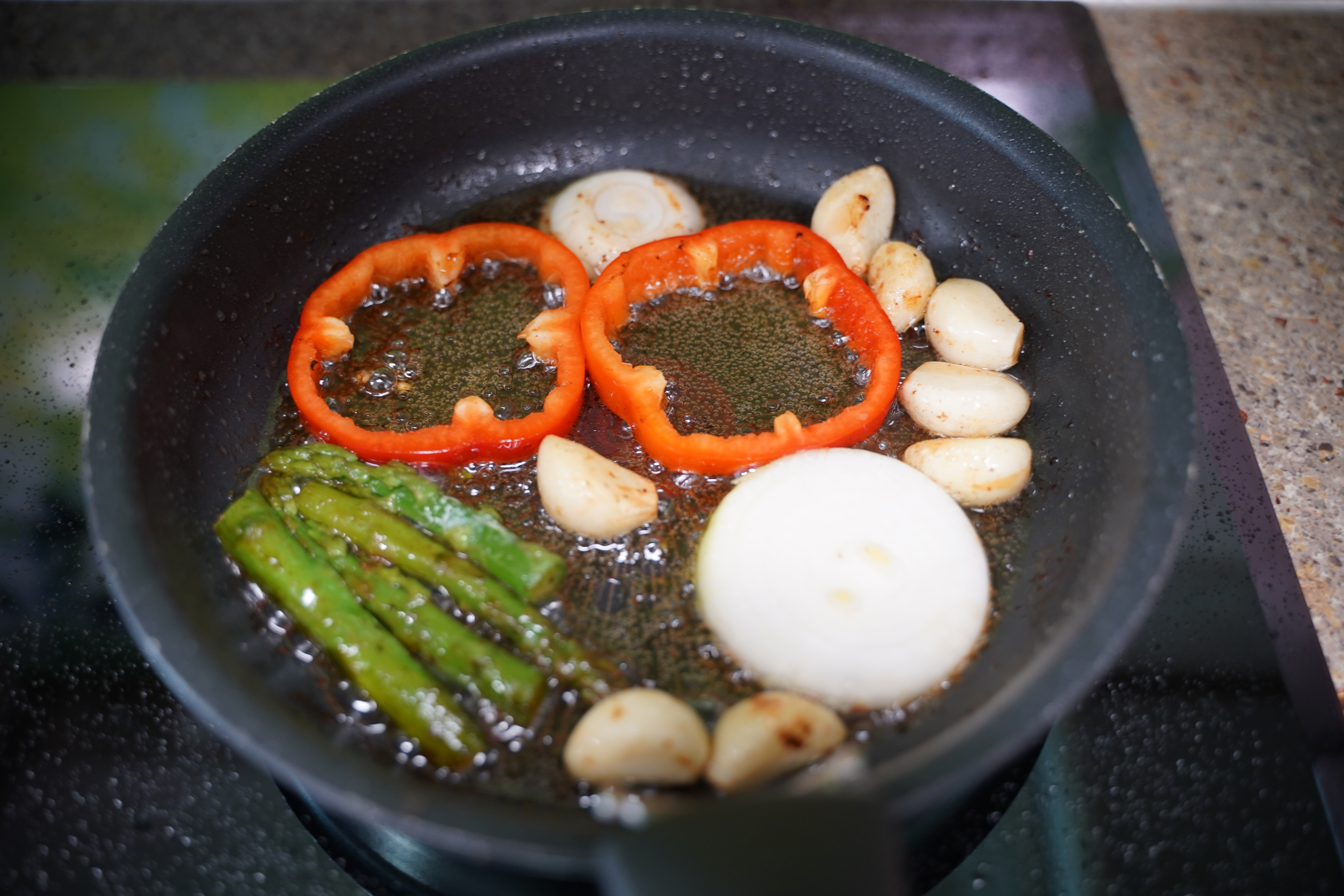 통마늘 한 줌, 양파, 빨강노랑 파프리카, 아스파라거스,