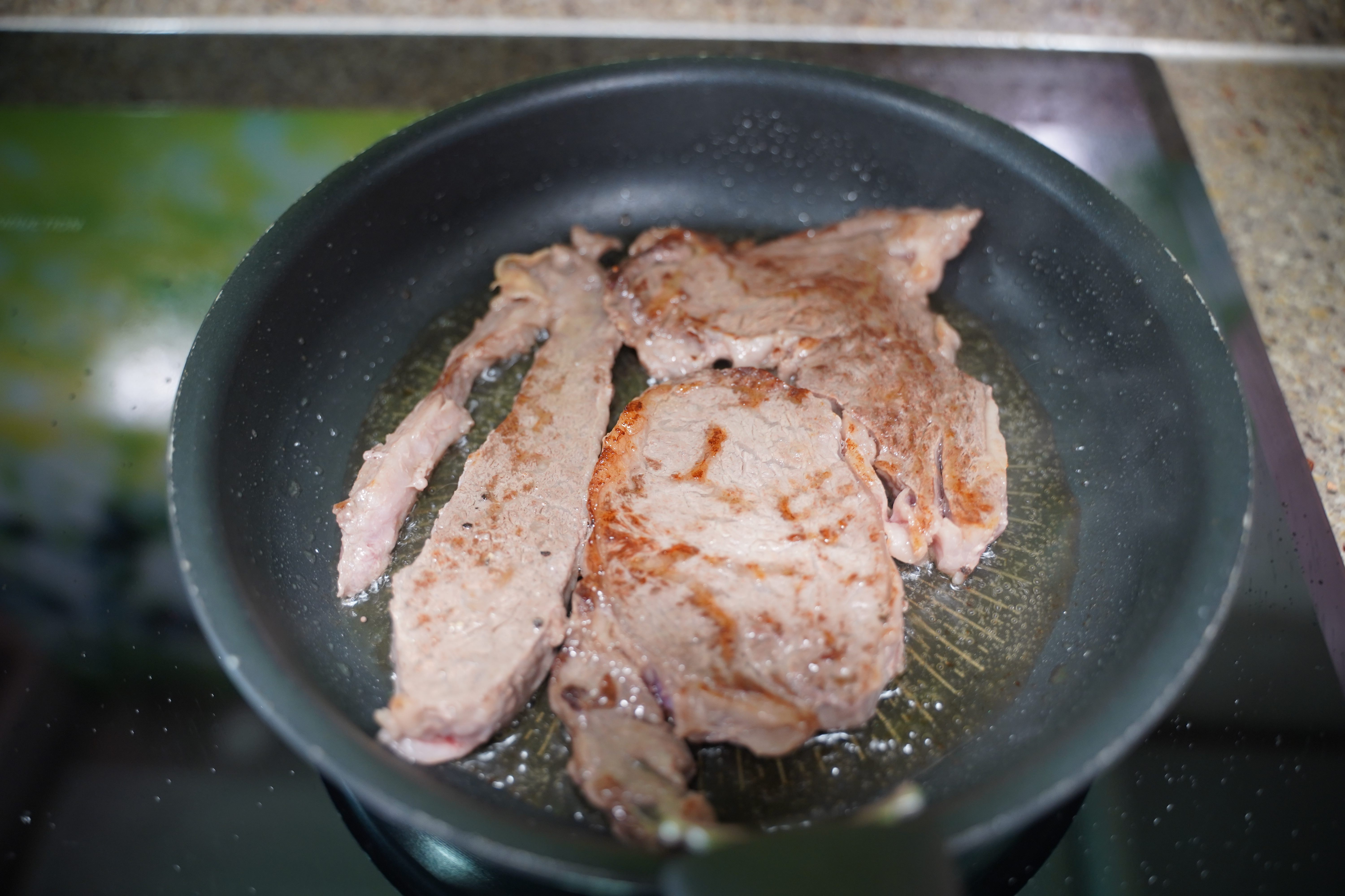 달군 팬에 올리브유를 두르고 고기를 중강불에서 1분간 구워요. 뒤집어 반대쪽도 구워요.